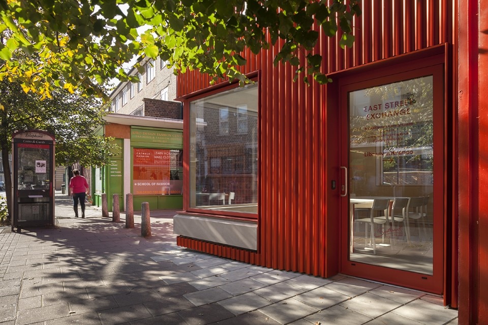 Red painted corrugated sheet metal cladding characterises the new extension of the East Street Library in London's Borough of Southwark.