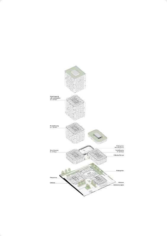 The towers are connected by an L-shaped footprint sectioned into three zones: one for businesses, another to be used as a kindergarten the final as an entrance and gym for residents. The next six levels will be marketed for rent, while those above – becoming more luxurious towards the top – will be sold.