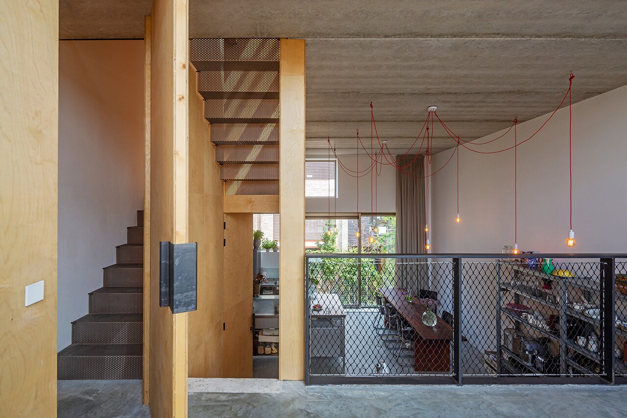 ANA Architecten distributes the house over five split levels, hiding all the facilities inside a wooden wall.