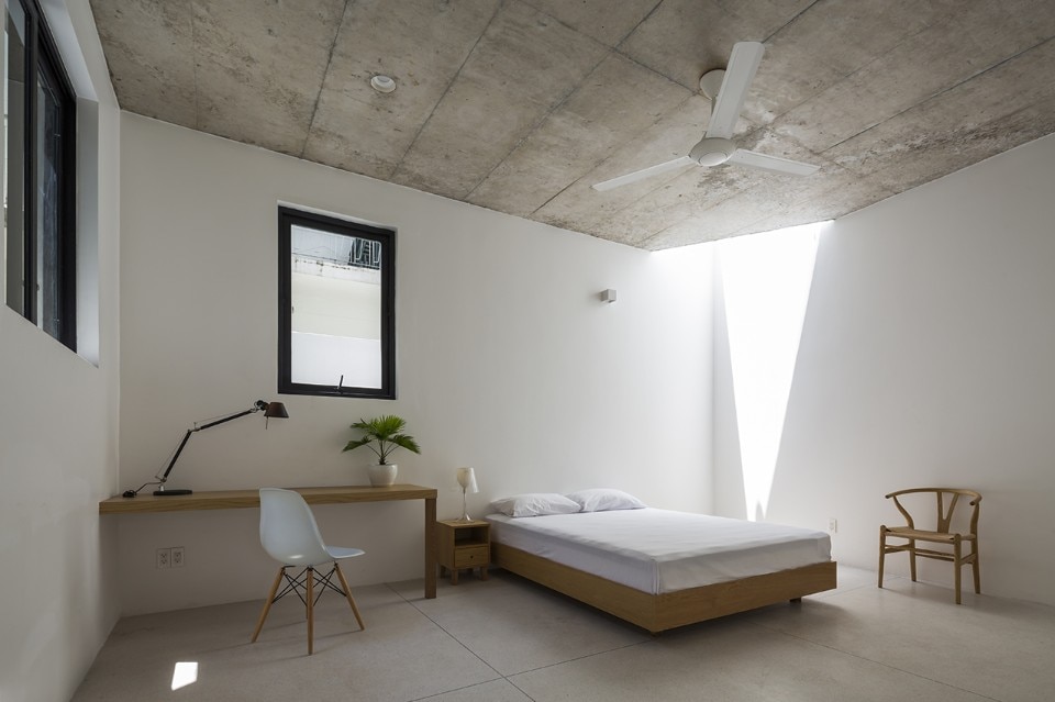 Due to the area's tropical climate, the natural light crossing through the building is at the same time a quality and a threat: therefore, all the main openings rotate from the side walls alignment to avoid its directs rays and rather take advantage of their reflection. A somewhat unannounced presence: a triangular skylight brings a perfectly vertical sunlight into one of the ground floor’s bedrooms.