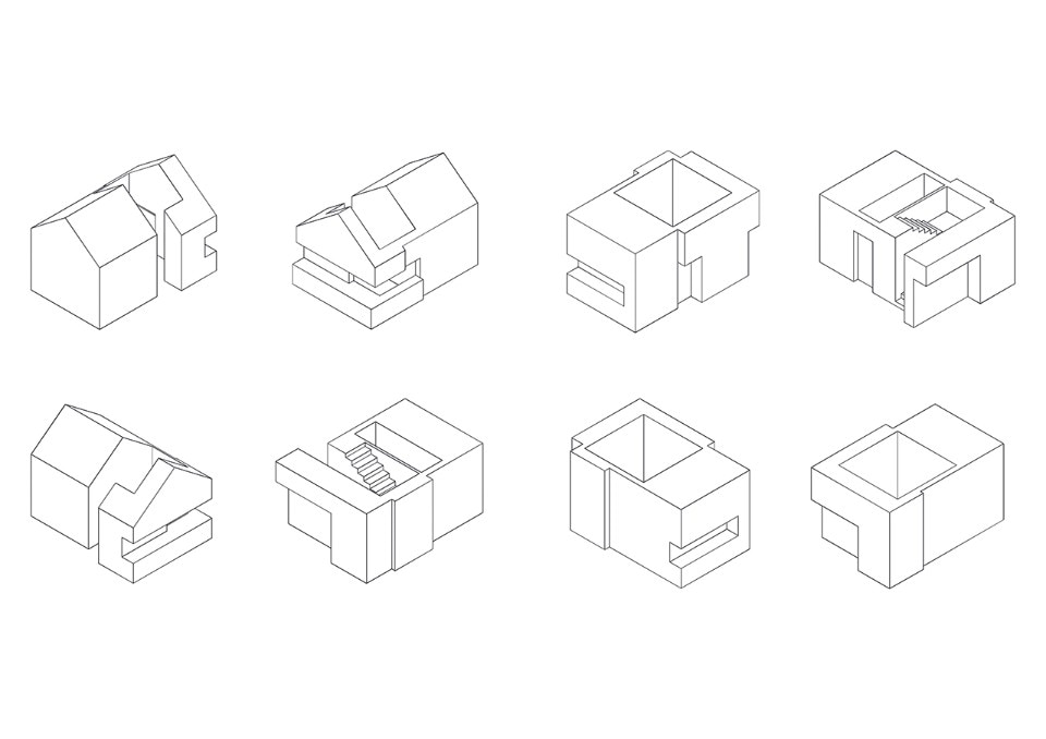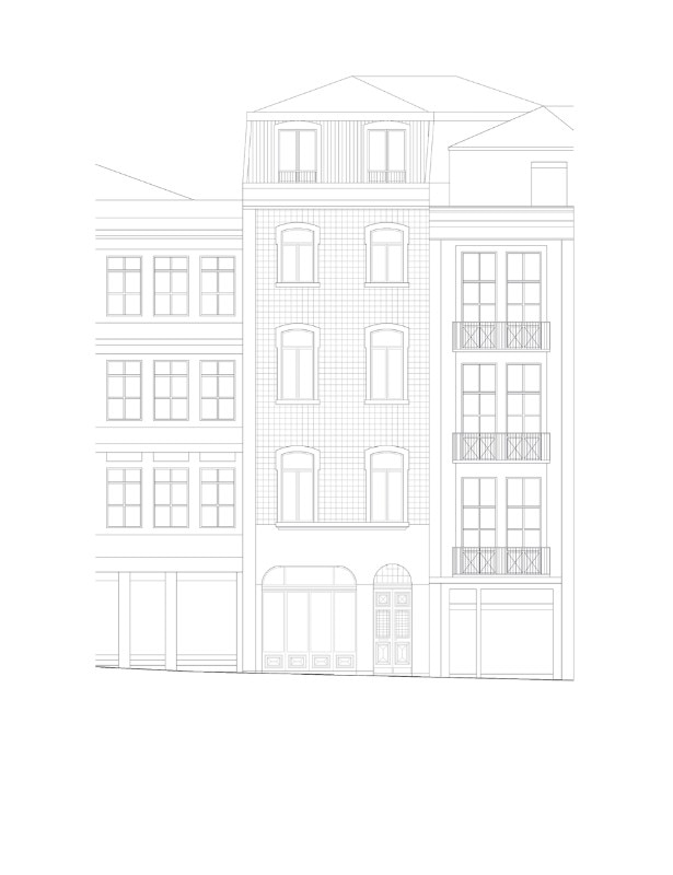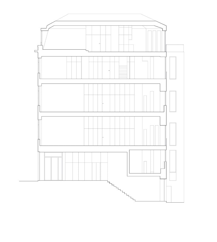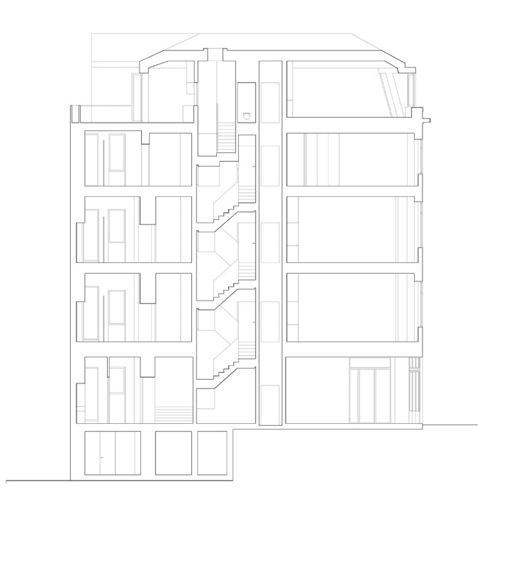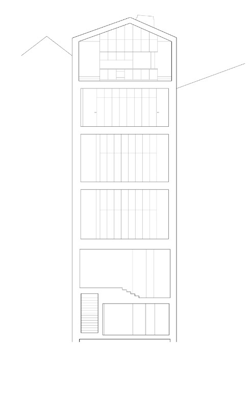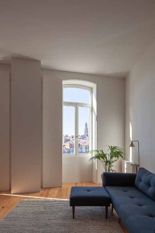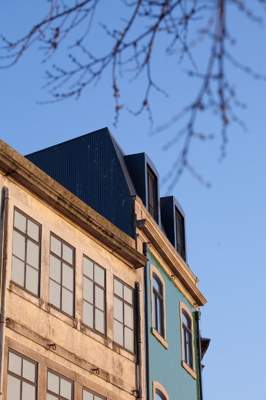 The street facade of Casa Chã has been left unaltered, so as to mimic the historical context of Porto's city centre. The only sign visible from the outside is the top floor, which is covered with a dark-coloured trapezoidal sheet metal, representing an intervention that is the result of the history stratifications and is able to interpret a more mobile and flexible contemporary life.