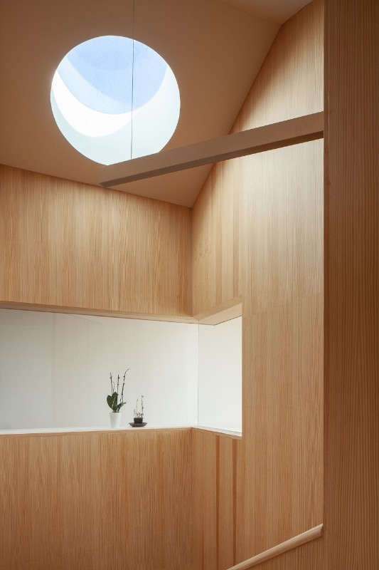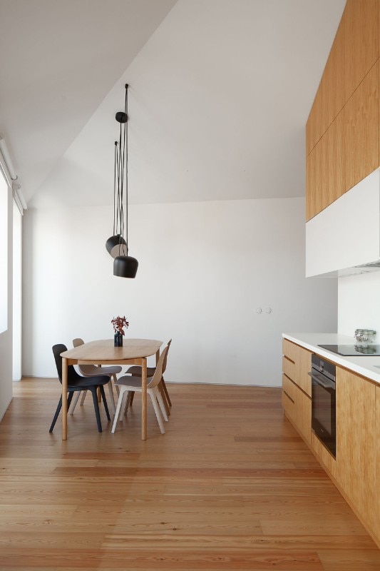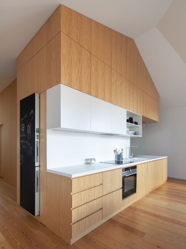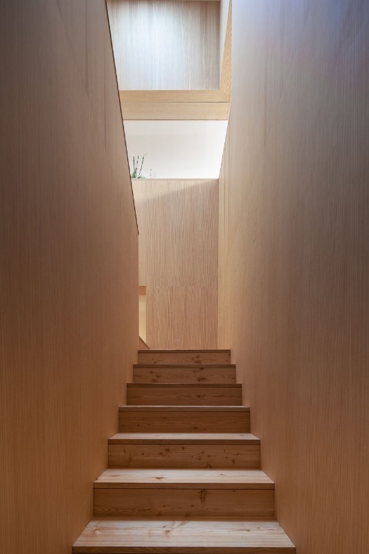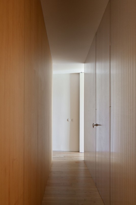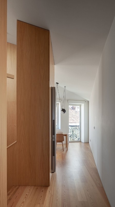 This situation is taken from the architect as a starting point and pivotal element for the whole project. In addition to connecting the apartments vertically, the new vertical distribution becomes a sculptural wooden element, recalling the warm materiality of the renovated dwellings.