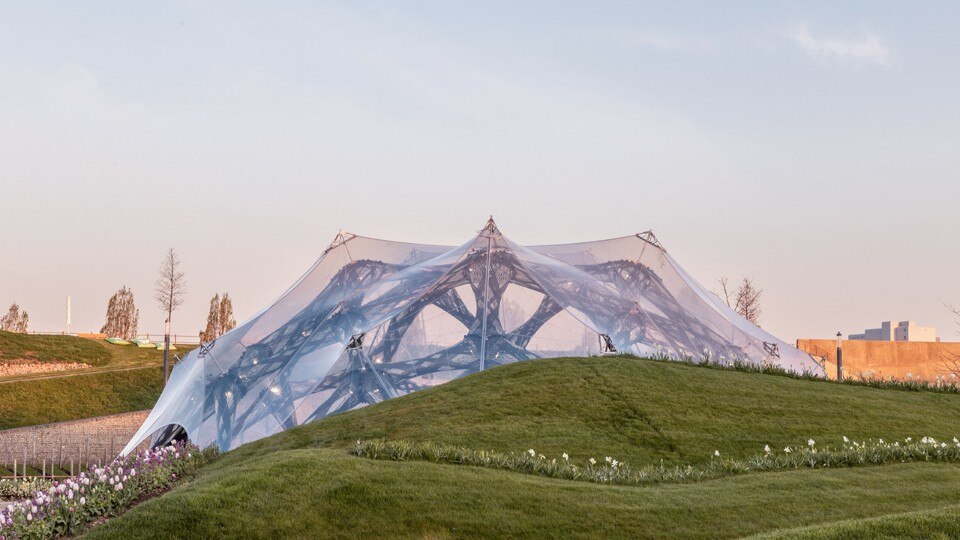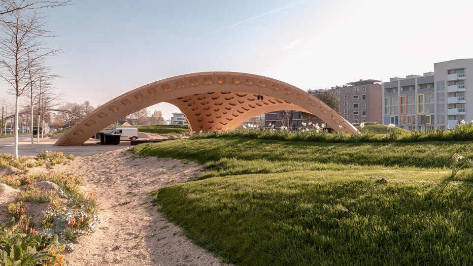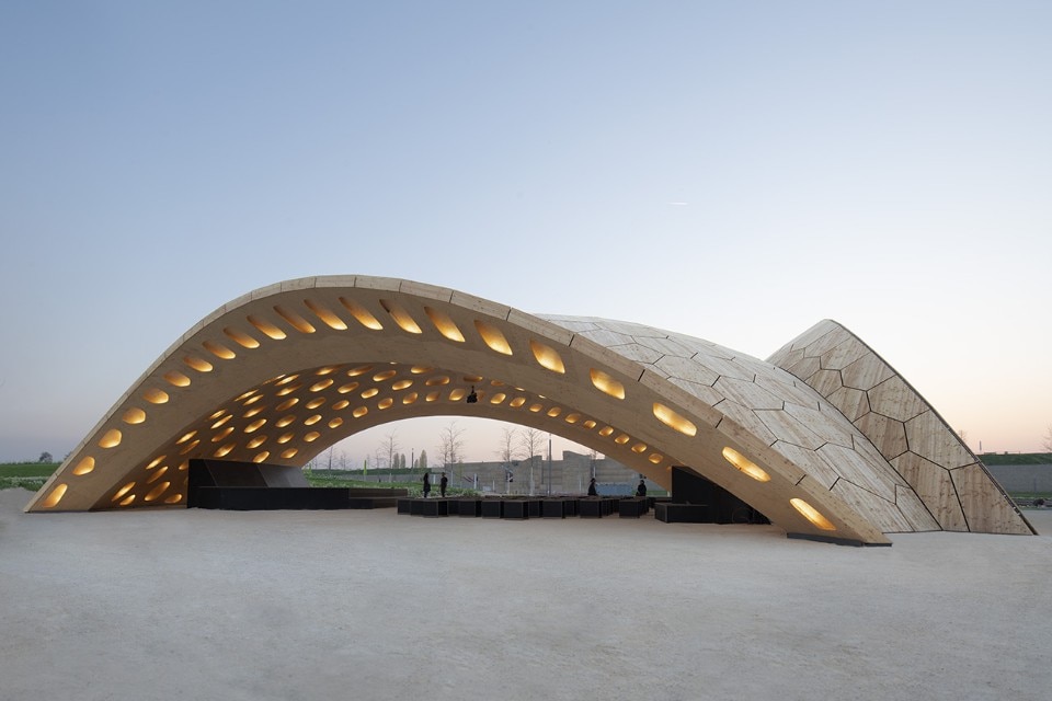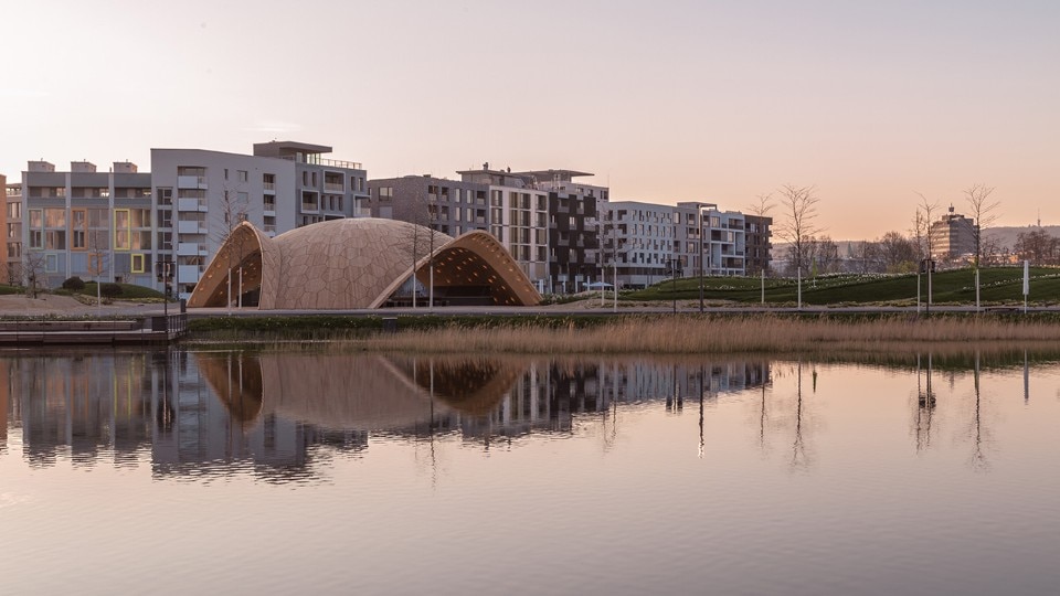 Two light-weight wood and carbon-fibre pavilions – Buga Wood Pavilion and Buga Fiber Pavilion – installed at the Bundesgartenschau Heilbronn horticultural show in Germany represent the first step in taking robotic and digital fabrication techniques developed at the University of Stuttgart off campus.
