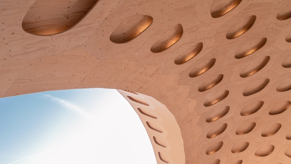 research into biomimicry in architecture. The fibre pavilion is woven around a framework, while the wooden structure is made from glued sheet, rather than CNC-milled, material.