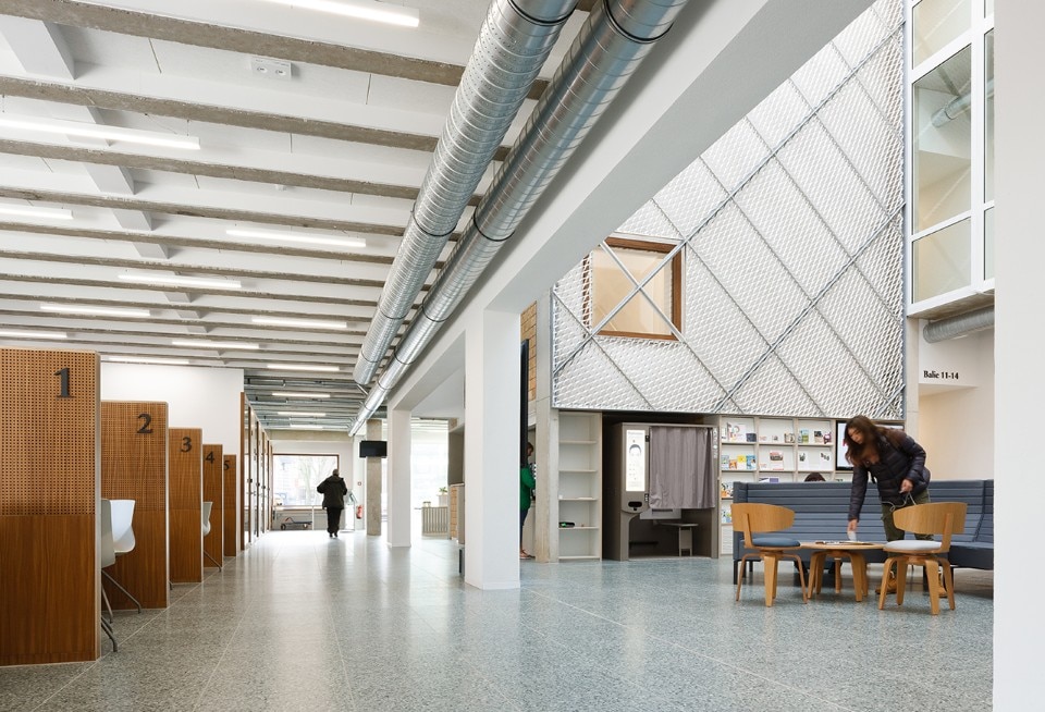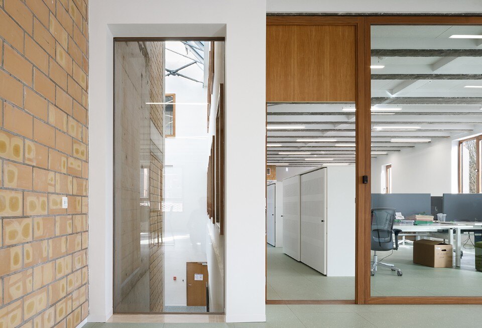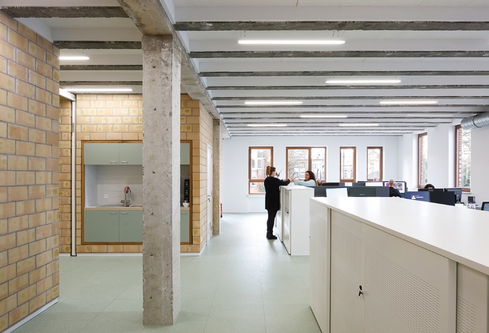 Plusoffice Architects has renovated Kontich City Hall in Belgium, with the insertion of new open, transparent volumes into the existing concrete and brick structure, allowing for a radical change in the interior layout.