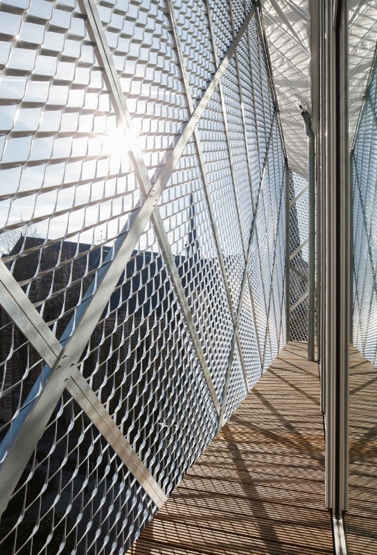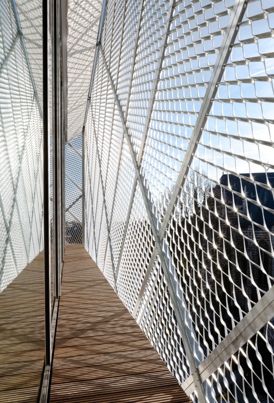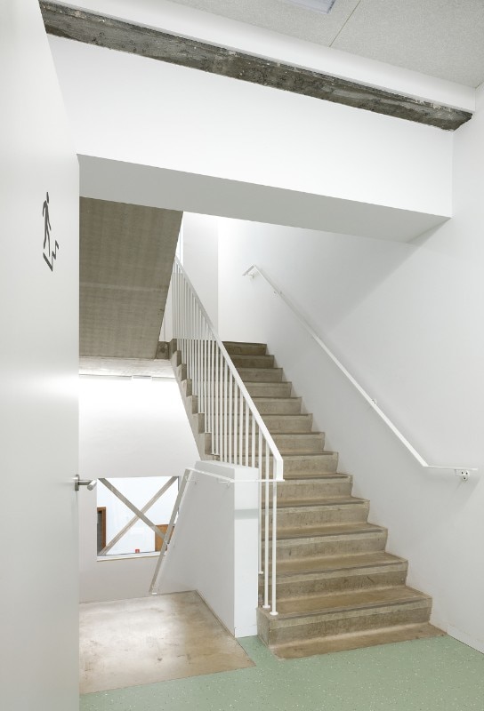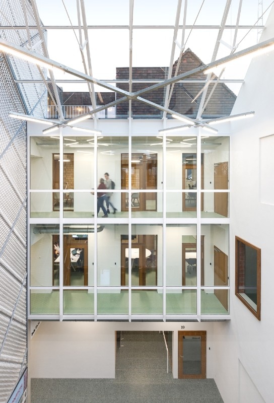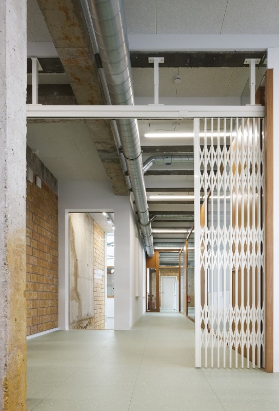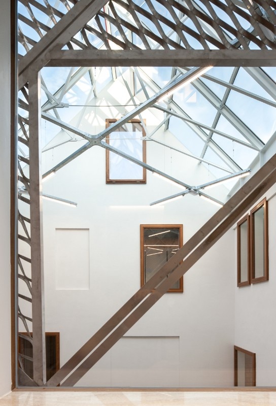 Concrete structure and existing brick walls are left raw and exposed, so as to contrast and emphasise the smooth and essential materiality of the new glass and metal additions.