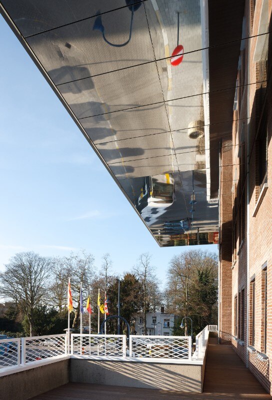 The new council chamber has been placed overhanging the existing brick blocks because of its excessive shape and size compared to the scale of the existing spaces. It becomes the external symbol of the architectural intervention, the new landmark of the small Flemish village.