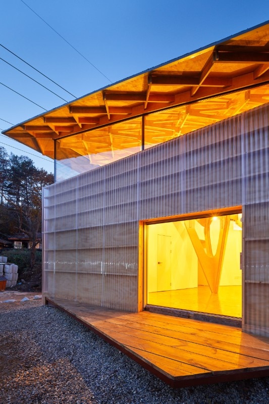 The house is hexagonally shaped and hosts three tree-shaped structures to support a pitched roof made of sandwich panels with asphalt shigles that improve water drainage. The materials used are the ones most commonly used in South Korea’s rural areas, such as the corrugated polycarbonate and plywood panels for the perimeter walls. The overall translucency gives an ethereal touch to the building, while indoor light is provided by a perimetral skylight and large wall openings. The interiors are treated with a gypsum white wall and local larch plywood with paint coating on the floor.