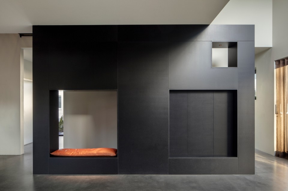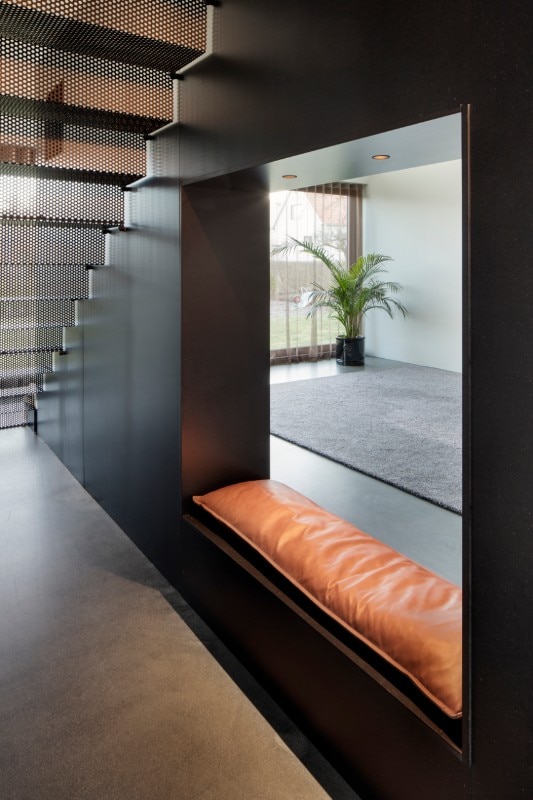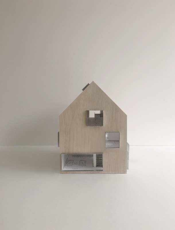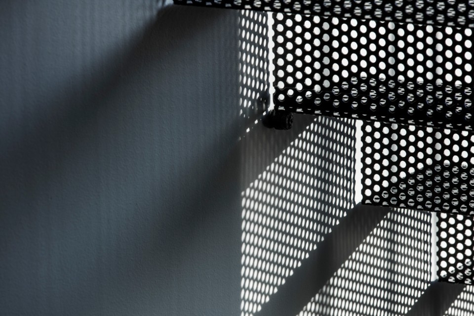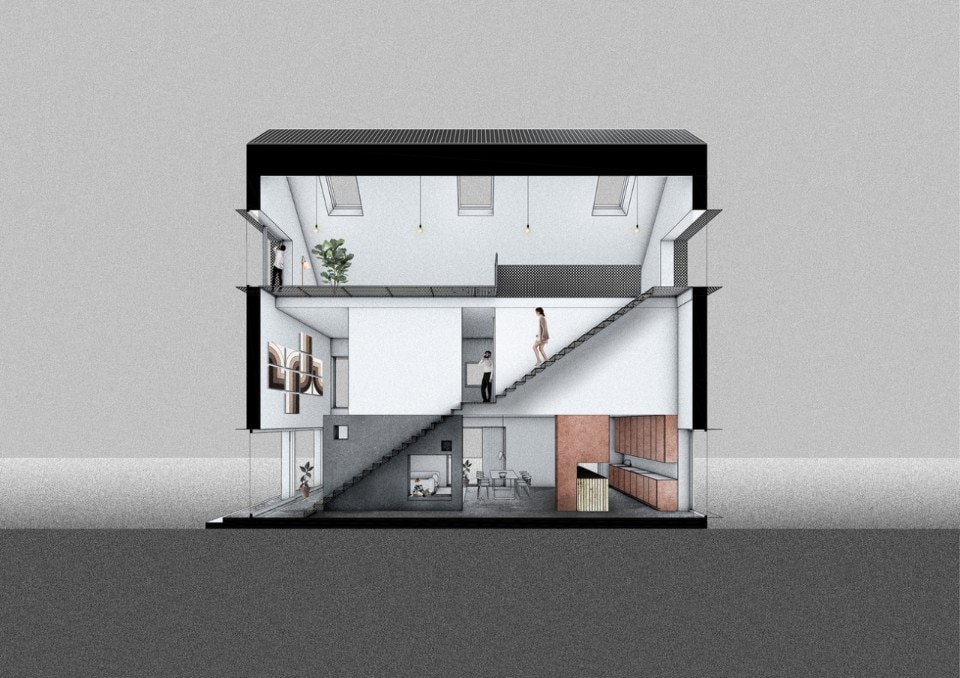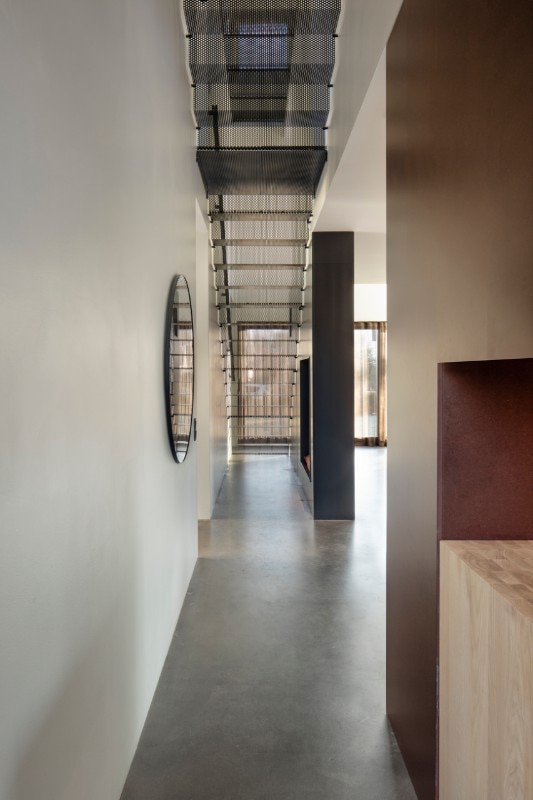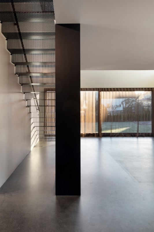 Inside the house folded sheets of perforated steel form a staircase body, with a ramp that cuts the volume of the house diagonally and runs through it in all its depth. Double and triple heights generated by the plastic element of the staircase and the perforated material used lead the natural zenithal light of the roof to expand throughout the house, defining a diaphanous volume and a dynamic interweaving of visual axes and perspectives.