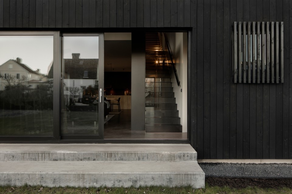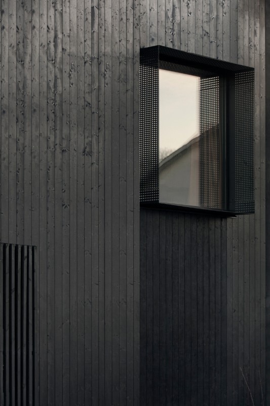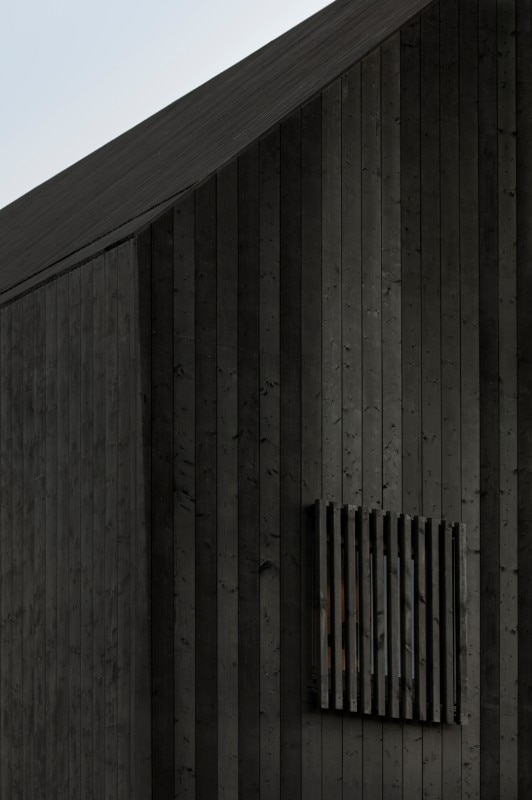 The house is entirely clad in tarred pine wood slats – a traditional Swedish method of preserving wooden facades and roofs – which gives the volume a rigorous and neutral image in the variety of shapes and colours of the context in which it is set.