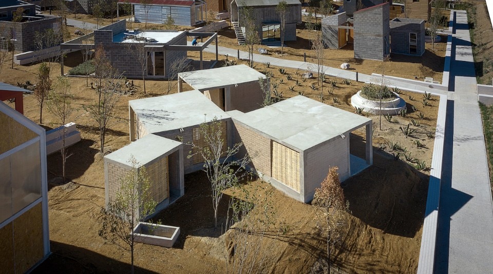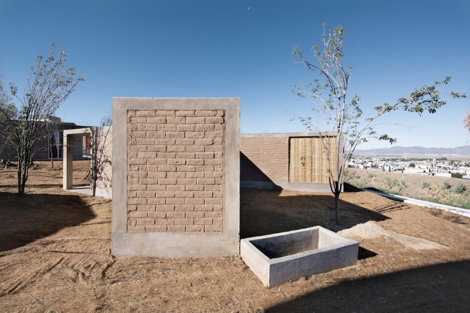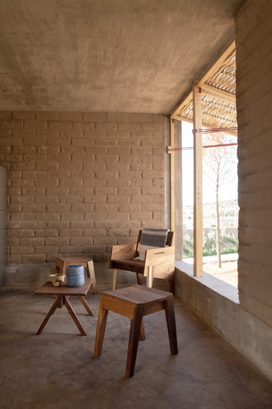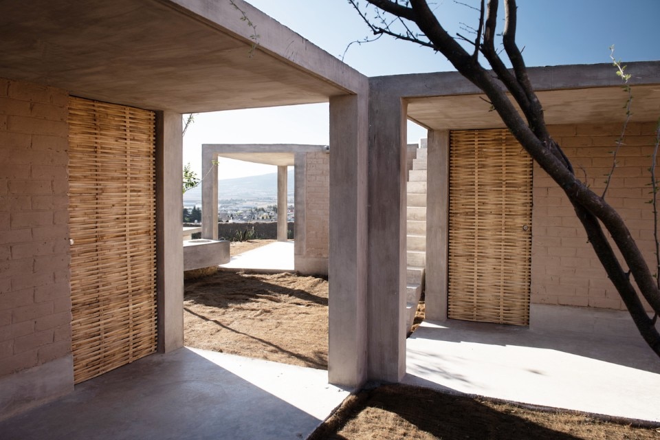 The green patios and niches that result from the slight rotations of the modules are important elements of the building and invite the residents to the outdoor living. Some traditional elements present in the exterior spaces are reinterpreted in a modern way – such as the table, the wood fire stove or the outdoor tub. The concrete frames of the volumes are resistant against earthquakes while the adobe blocks, made locally, constitute a natural climate buffer that absorbs humidity and maintains a cool temperature inside the building. Doors and windows are made of bamboo lattice allowing for air circulation, privacy and shading for the garden.