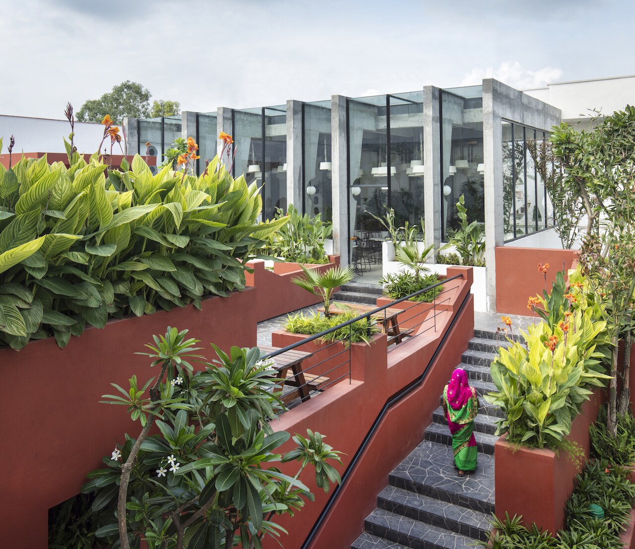 Designed by Portal 92, The Village Cafe offers an outdoor space punctuated by glazed, concrete and terracotta-toned volumes. The geometry and spatial layout of the project inspired by rural Indian settlements.