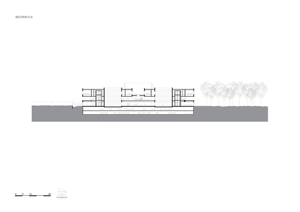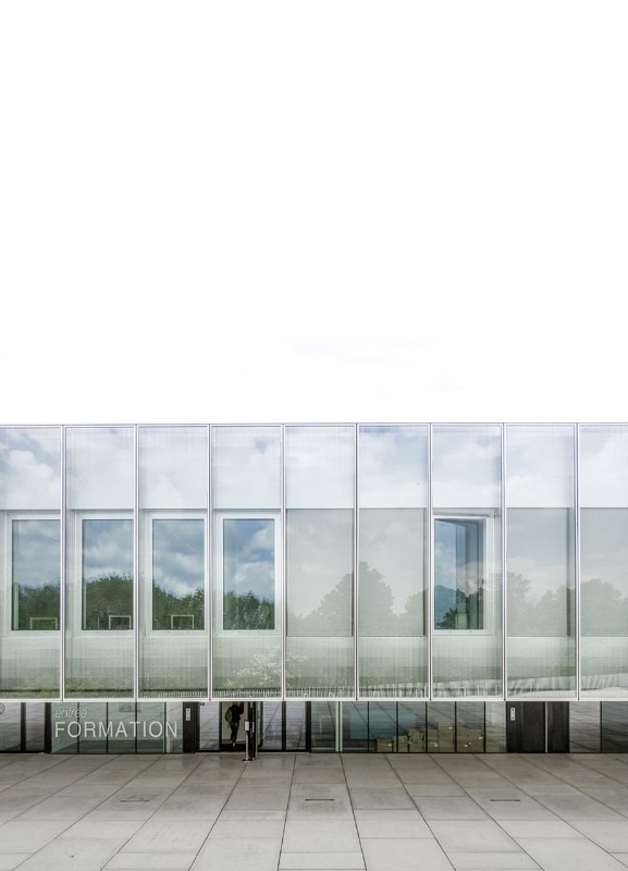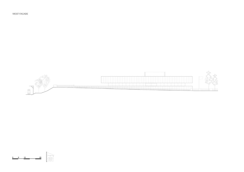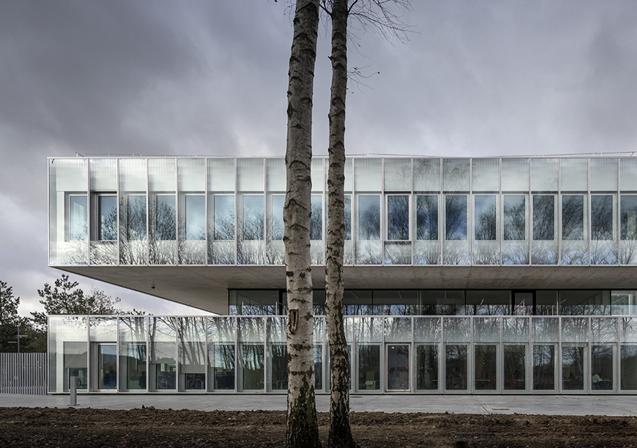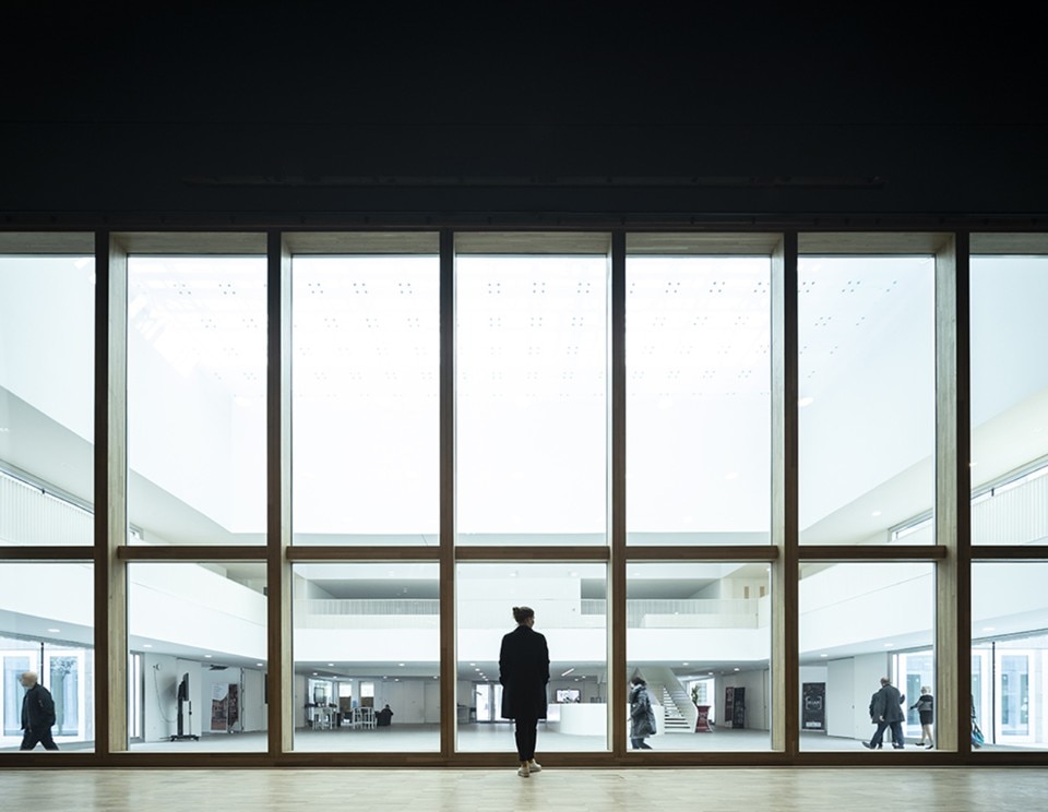Glazed facades with modular frames surround the entire square block on the ground and the second floor, while the central level is surrounded by a walkway that outlines the surrounding green landscape. On the first storey there is also a large terrace open to the north, which is one of the two main collective spaces of the CMA.