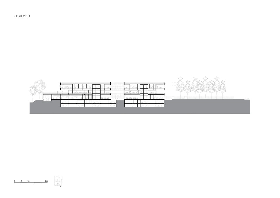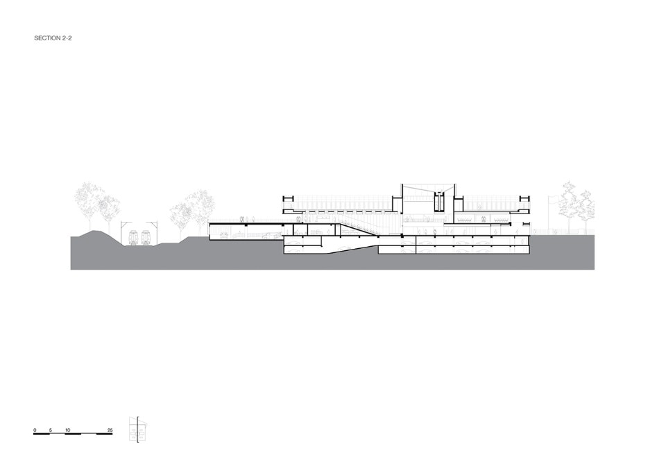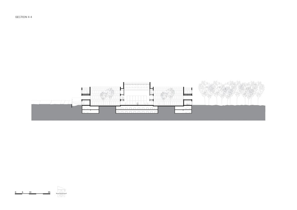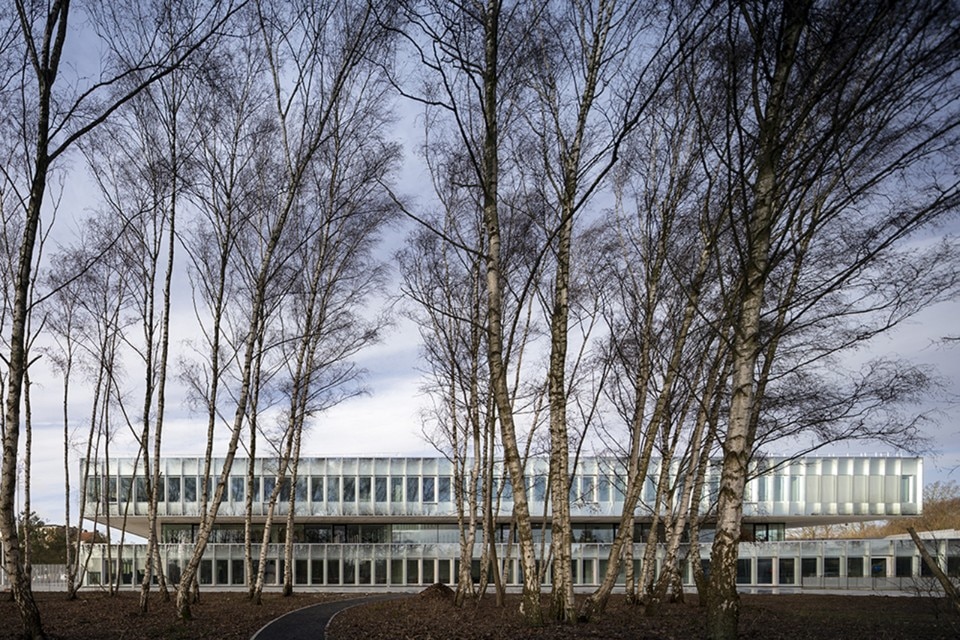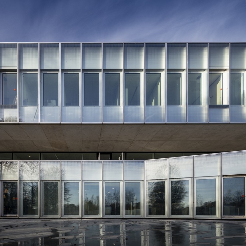 Glazed facades with modular frames surround the entire square block on the ground and the second floor, while the central level is surrounded by a walkway that outlines the surrounding green landscape. On the first storey there is also a large terrace open to the north, which is one of the two main collective spaces of the CMA.