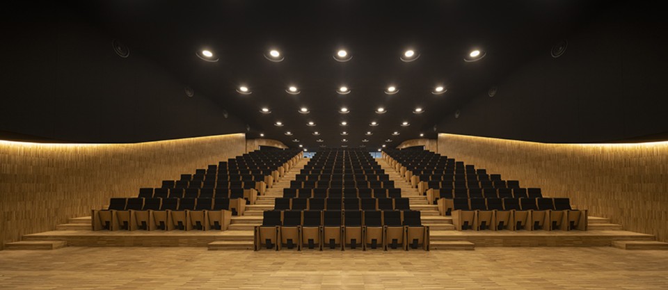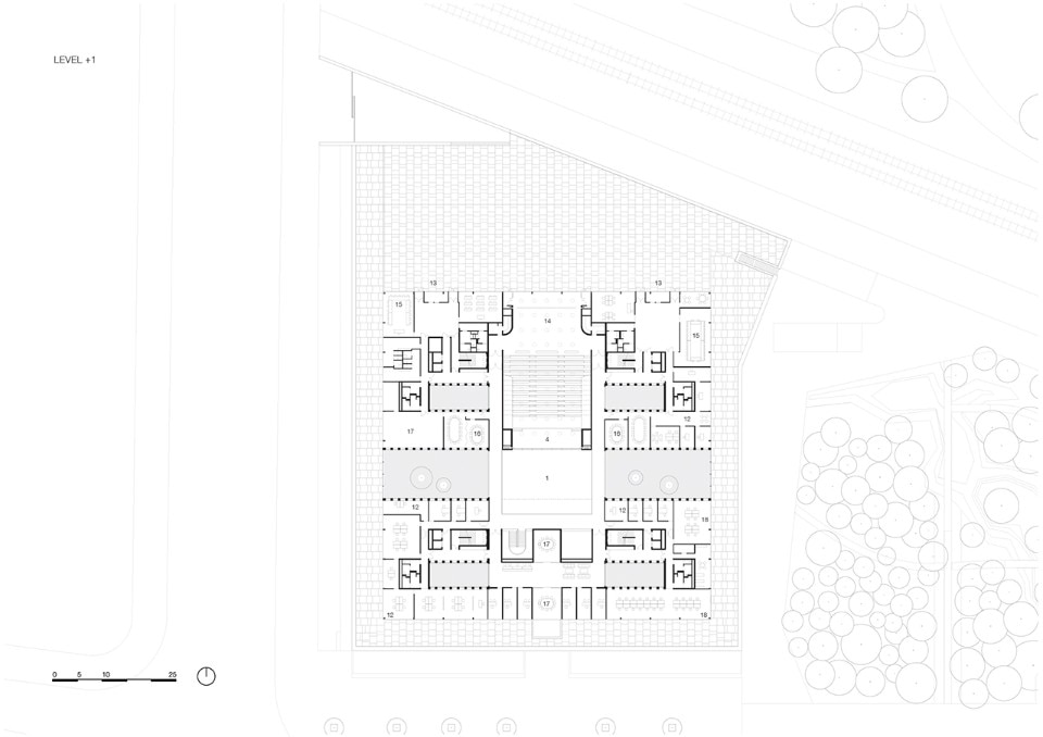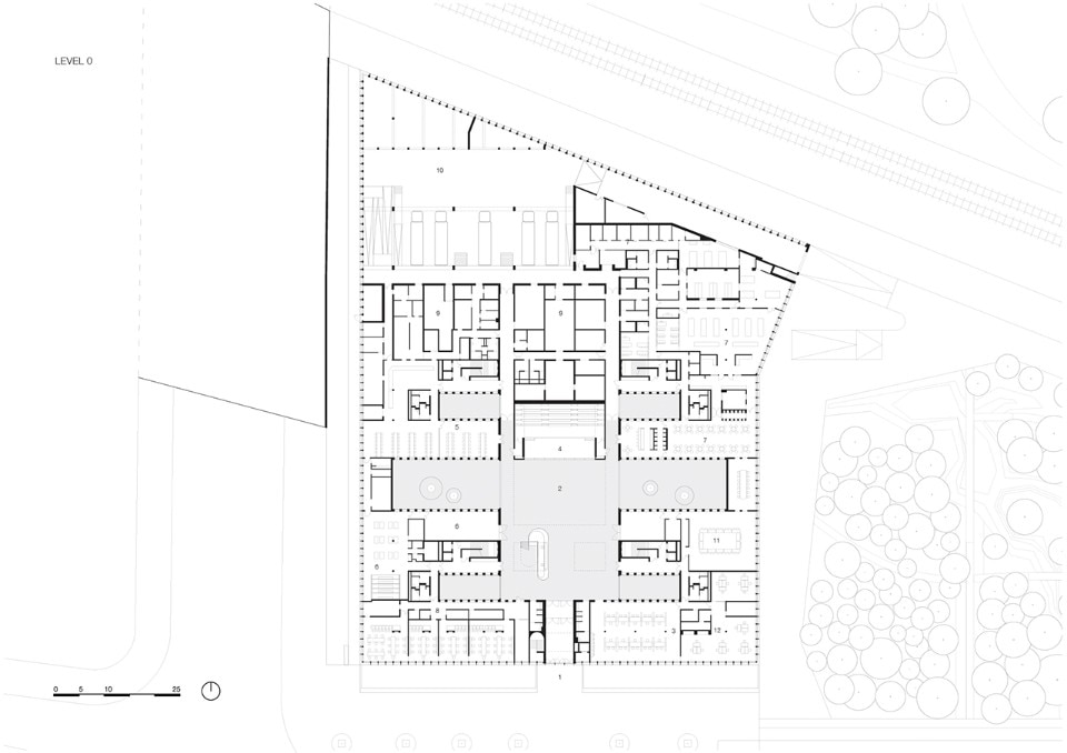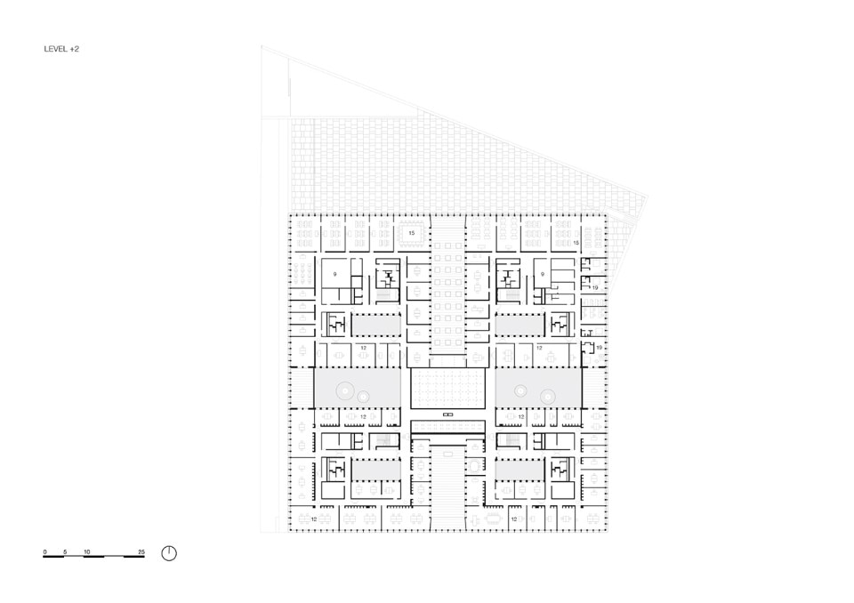 Despite the depth of the volume, the interior spaces are very bright, thanks to six stone clad patios and a central skylight that illuminates the large covered square at the ground floor. The building houses collective functions such as a large auditorium and spaces dedicated to the support of workers and craftsmen. There are local and regional government offices and areas dedicated to research and education.