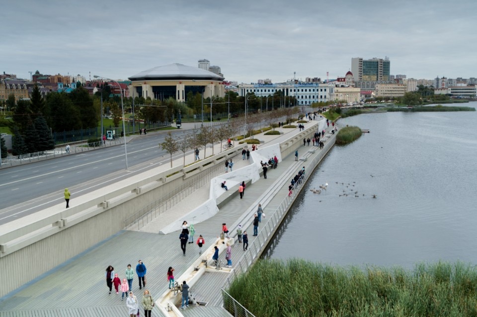 Locals like to describe the Republic of Tatarstan as the Switzerland of the Russian Federation: multi-ethnic, multicultural, with Catholics, Orthodox and Muslims peacefully coexisting, a very solid economy and considerable independence from Moscow. In four years, over 350 parks and public spaces have been developed through a participatory design approach. Here some examples: the Kaban Lake, one of the oldest places in the capital, and its embankments, that the Russian-Chinese consortium Turenscape and MAP architects redeveloped and transformed into an ecological walkway that serves as an ideal bridge between water and green spaces, completed by a series of red locally made benches, "because the original Chinese ones were too expensive," the guides explain; the Gorkinsko-Ometyevsky Forest, where you can ski while listening to the music being diffused by some suspended speakers; the White Flowers Boulevard, whose name is inspired by the most famous work of Abdulrahman Absalyamov, one of the greatest Tatar writers.