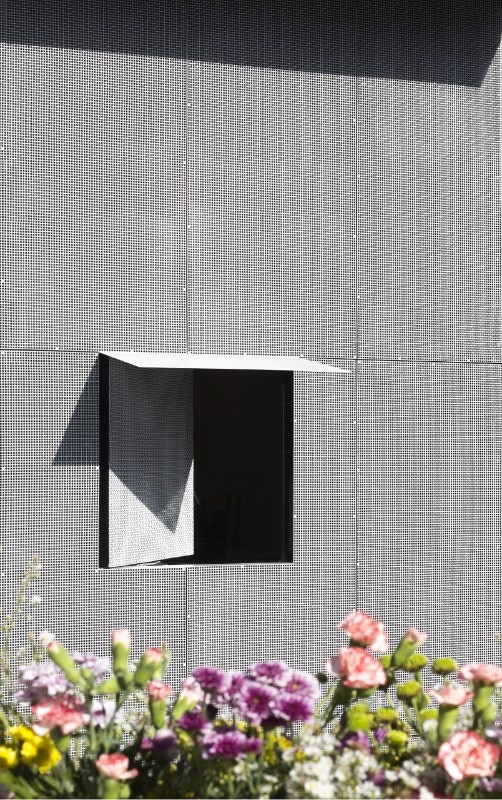 Architect duo redesigned the shop's facade using only a simple wire mesh, which generates an elegant and modern pattern. Only a small window connects the kitchen with the outside, as the door is hidden in the front. When the window closes, the facade appears completely silent and uniform in the cladding.