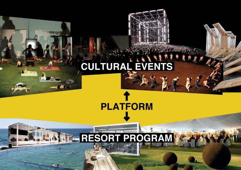 The main body of the complex contains the hotel rooms and other annexed facilities, including an exhibition space and a sunset bar. The building, acting as an urban canopy, is suspended by pilotis to facilitate the fluidity of the ground floor, with the design of open spaces and a platform capable of hosting cultural events, but also to be a simple background for everyday public life. The roof, in turn, is accessible via a public walkway that connects the open space with the different functions, including restaurants, swimming pools and spas.