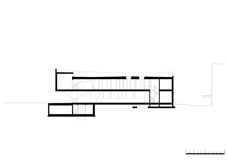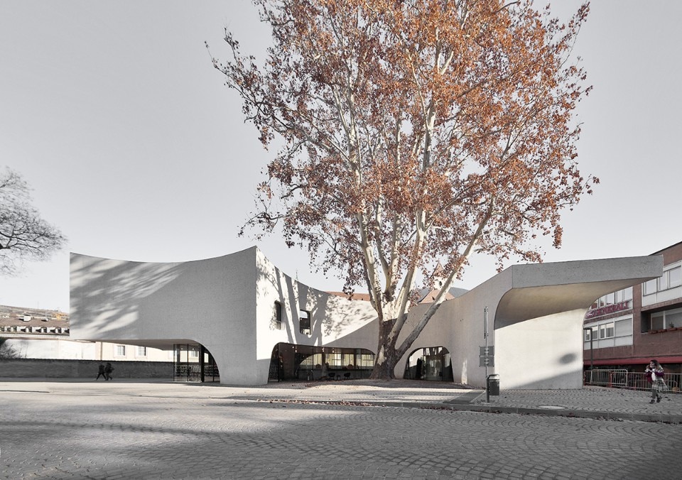 Built in bush-hammered concrete, the office was conceived around a large platanus and shaped following its canopy, creating a link between nature and architecture. Five arches spans surround the tree and support the building, making it lighter. TreeHugger, organized on three floors, combines concave and convex walls, large curved surfaces and voids. The ground floor space, slightly retracted below the concrete volume, is glazed and includes the entrance facing the public square.