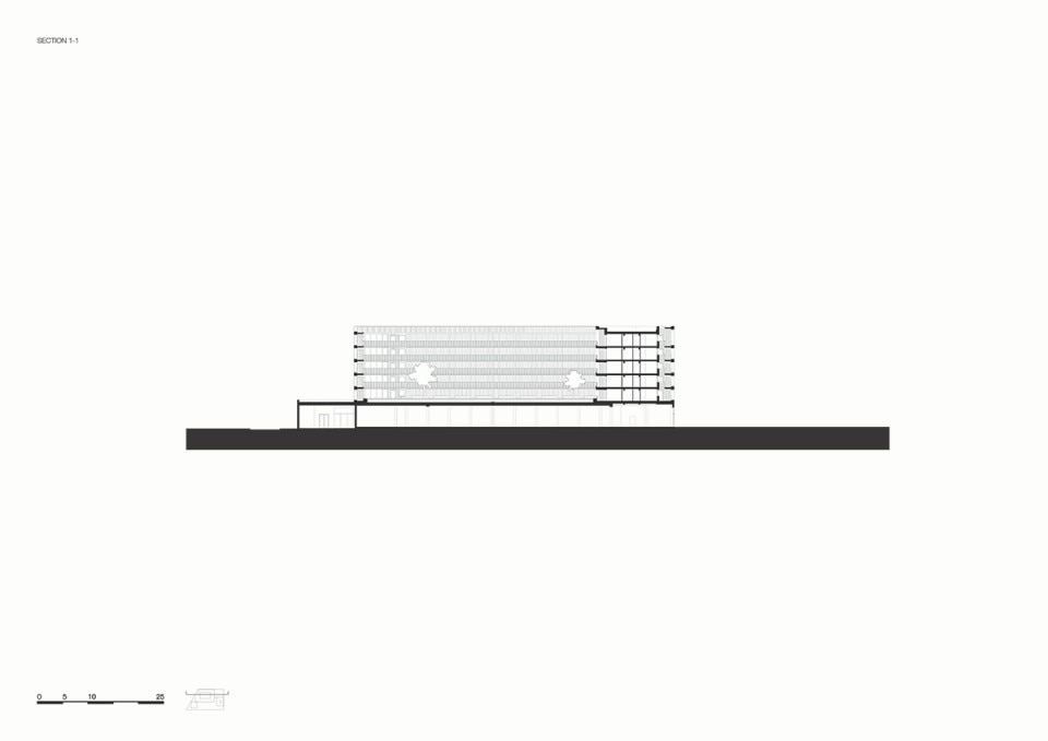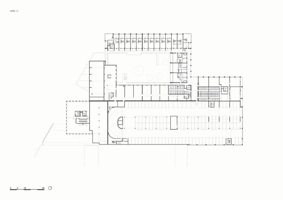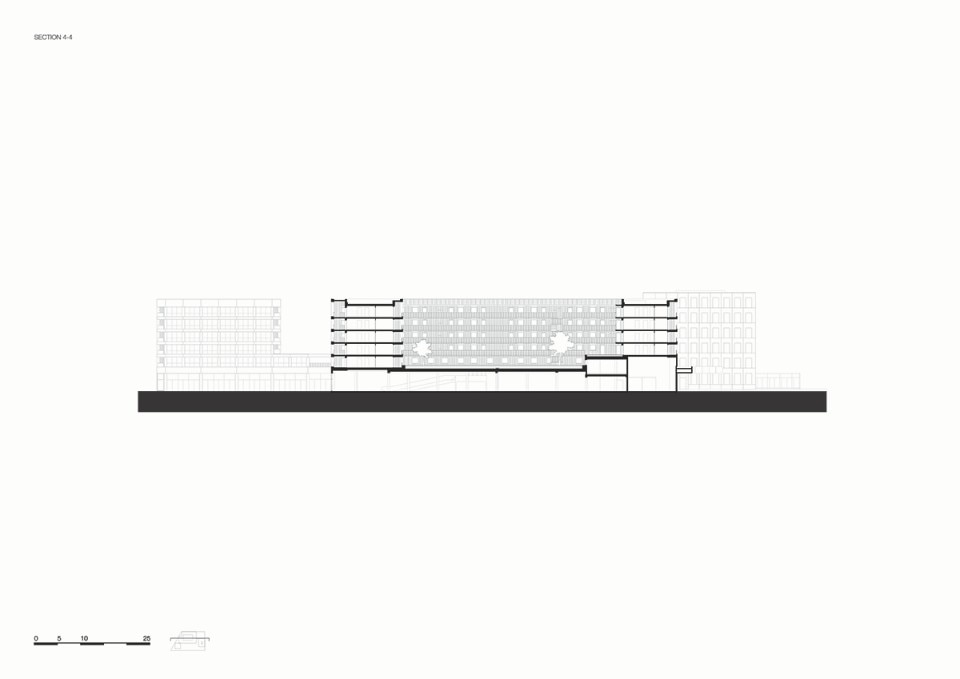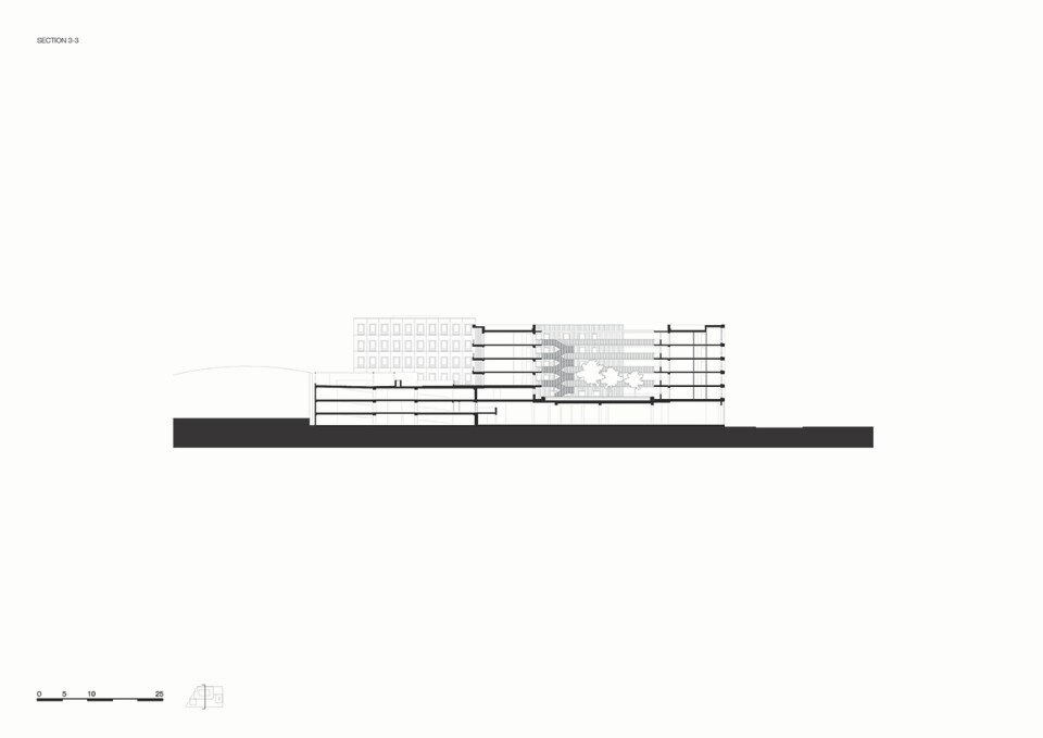 The available lot is surrounded by transport infrastructure and isolated from the surrounding urban fabric. For this reason the studio’s main aim was to create a new landmark by thinking the building as a device capable of channelling, through the program, the different flows of the neighborhood under construction.