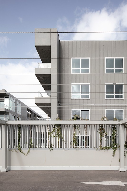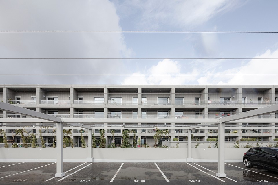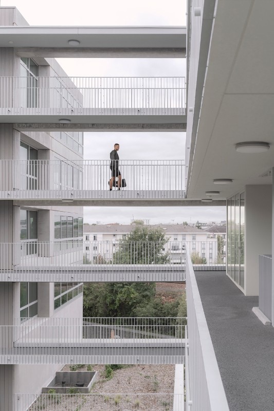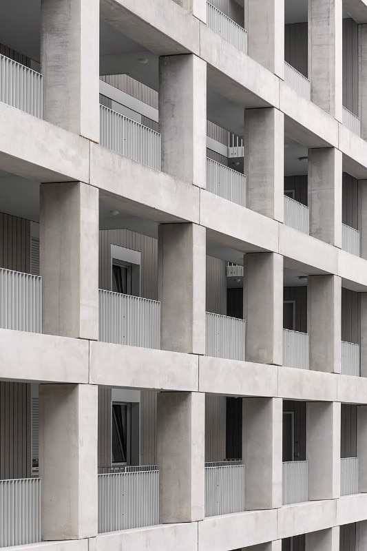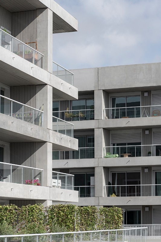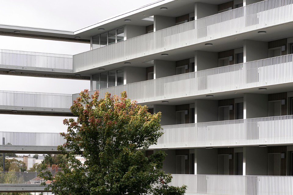 Bottière Chénaie has an extremely compact design, both volumetrically and on the facade. The five residential floors rest on a plinth containing commercial spaces, a supermarket and a car park.