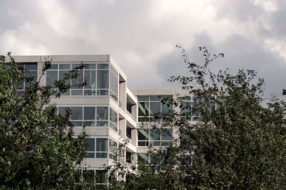 To make everything homogeneous, the monolithic facade has been designed with a 60x60 cm grid and a precast concrete structure that offers the possibility to have large windows and fully glazed corners.