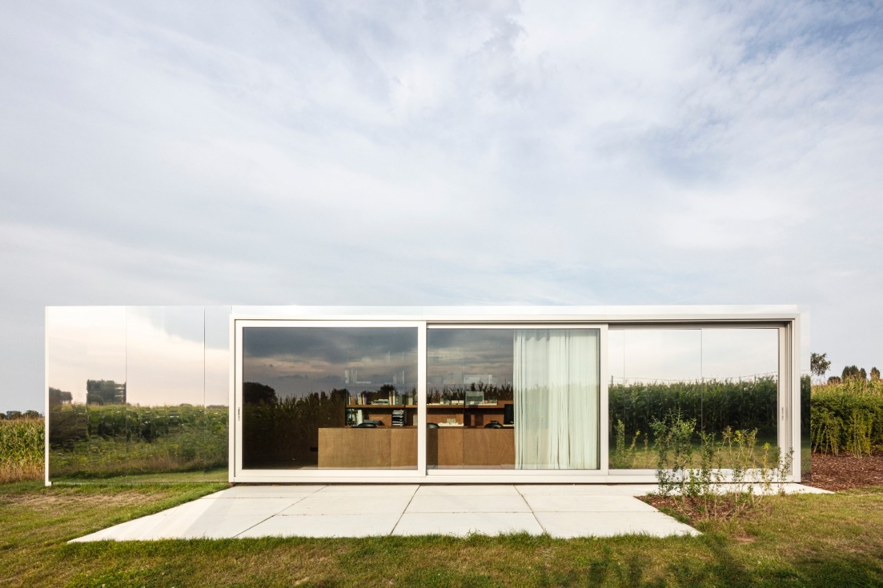 A huge glazed sliding window is set in the city office to reflect the surrounding garden, while mirroring aluminum panels are used to clad the countryside office to make it invisible in the landscape. Both offices are covered inside by red plywood – a typical construction element proving the potential of low-budget materials. According to the studio’s intentions, their offices can be placed in more sites and become a polyptych.