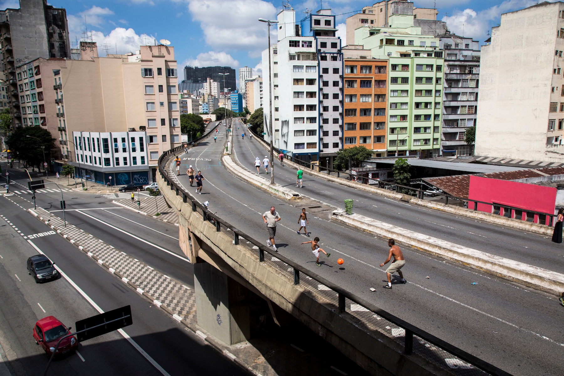 Opening image: the Minhocão on a Sunday, when the overpass running through the centre of São Paulo is closed to traffic and turns into a football pitch for youngsters and a jogging track/cycle path for the city’s inhabitants. Photo: Christopher Pillitz.