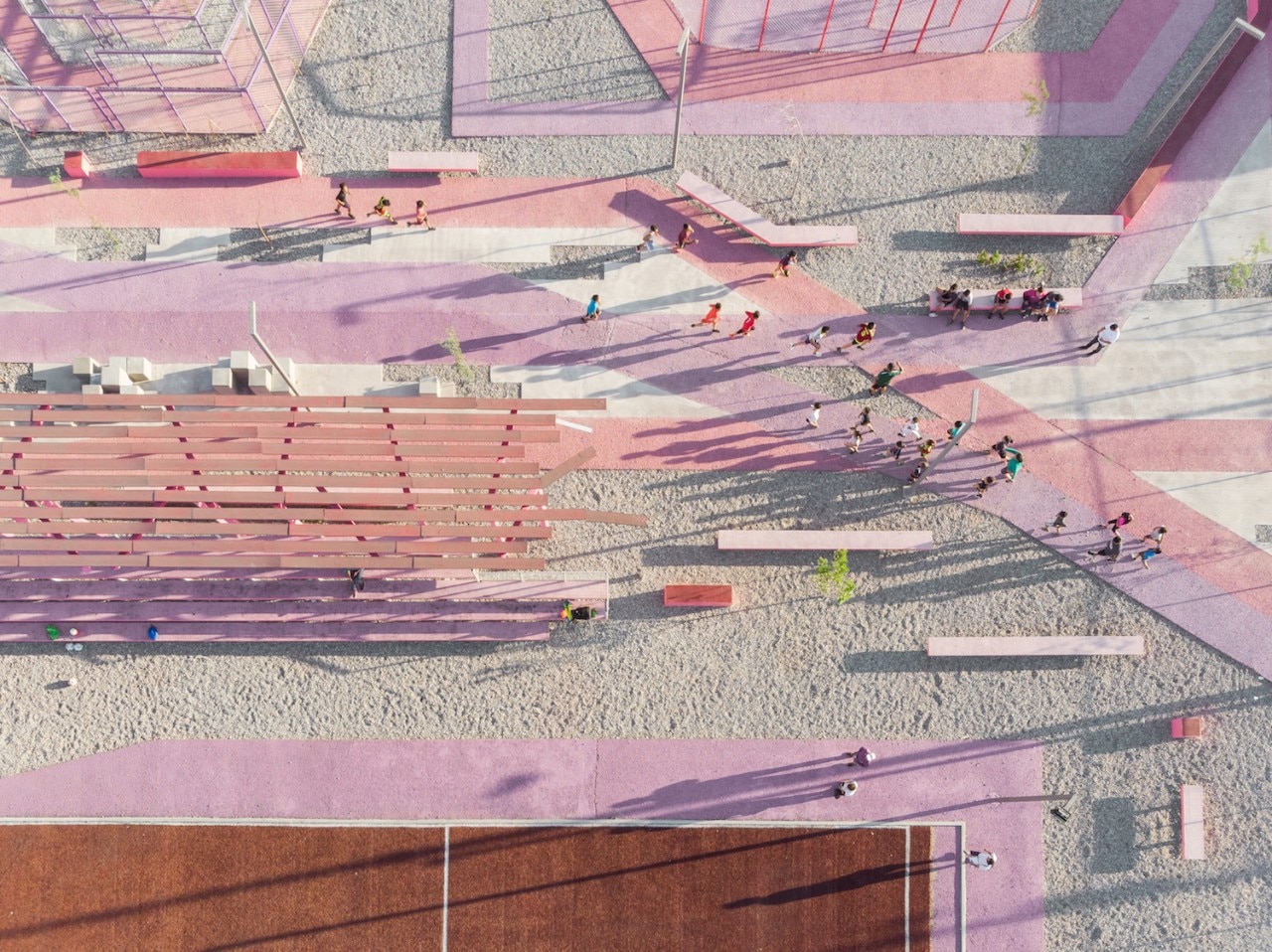 Every element, from the furnishings to the sports fields, is characterized by the use of pink in contrast with the surrounding buildings, with the intention of strengthening the identity of a project oriented both to become a public attractor on an urban scale, and a place that guarantees the common benefits required by the neighborhood and by kids.