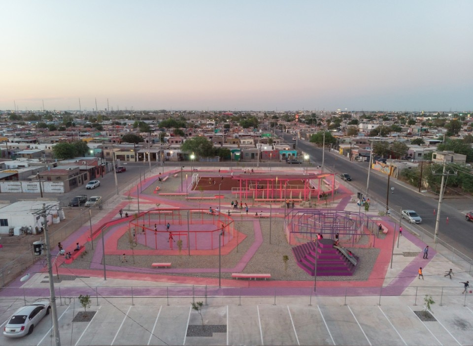 The Mexican studio DVCH De Villar CHacon Arquitectos has redesigned a disused space in the suburban area of Mexicali, the Mexican city bordering with Calexico in California, creating a new playground with rest areas, protected from the strong sun thanks to the shade created by wooden pergolas and trees.