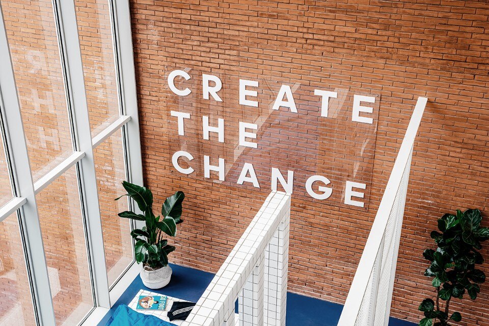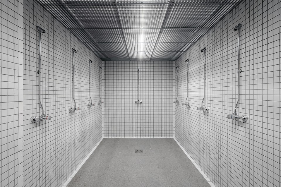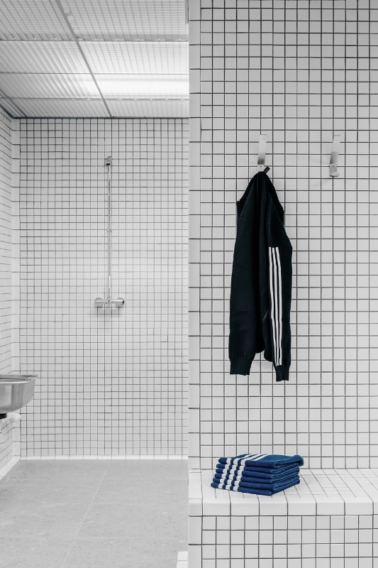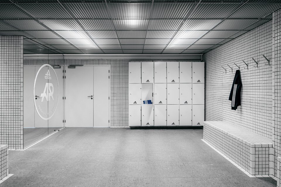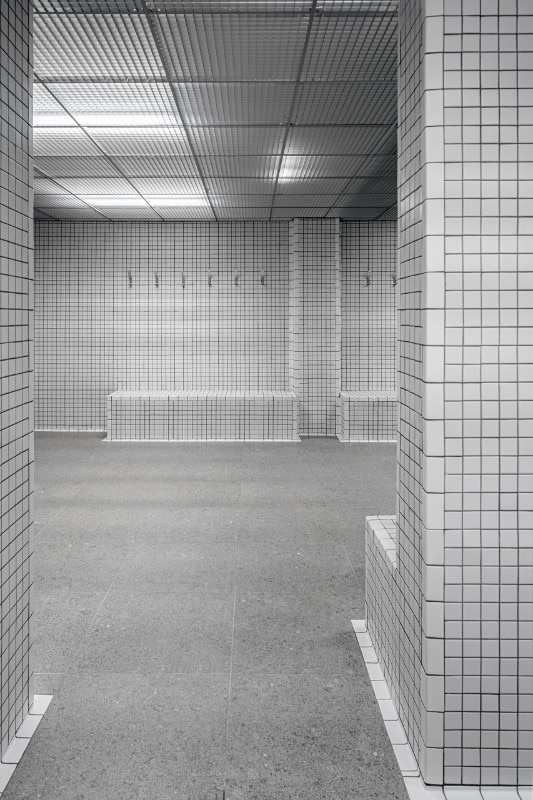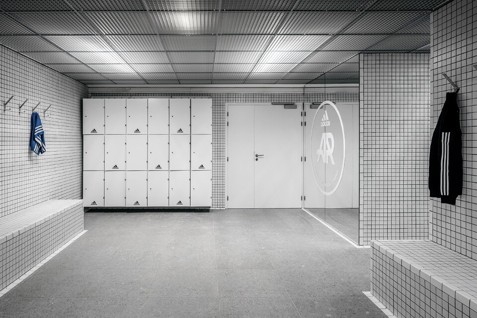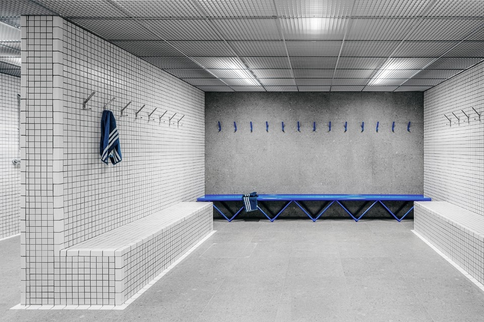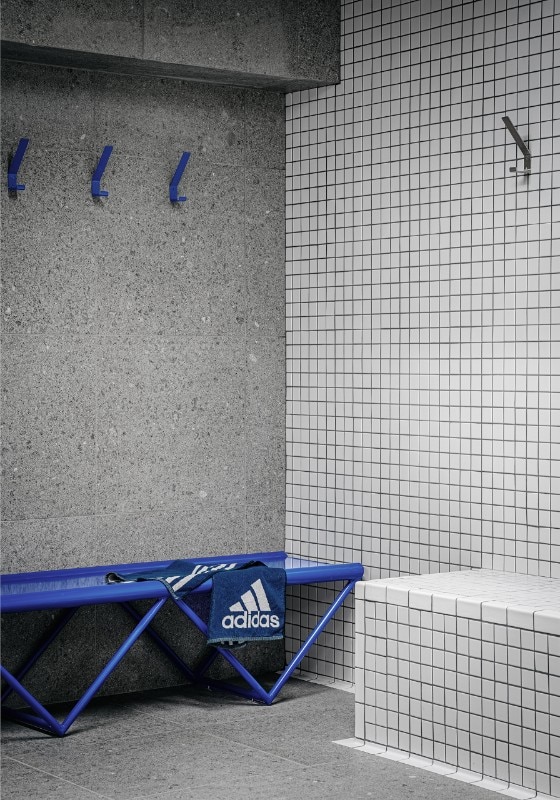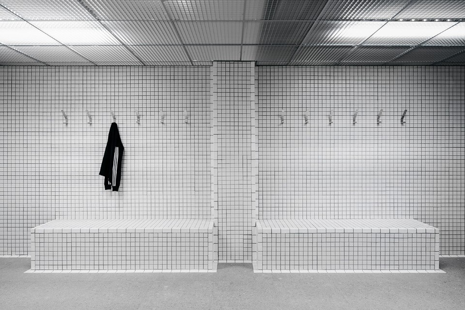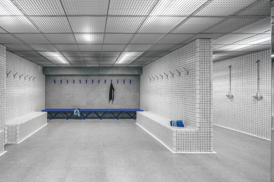 Delimited by two brick walls and two glazed walls, the main room of the headquarters features a contrast between the electric blue smooth floor and the white of the furnishings, metal grilles and square pattern cladding. This motif, with various variations and balances, can be found in all the spaces of the project: corridors, bathrooms, offices and meeting rooms. In particular, the changing rooms are completely enveloped by a geometric pattern that makes it an abstract environment, making the colorful benches stand out.
