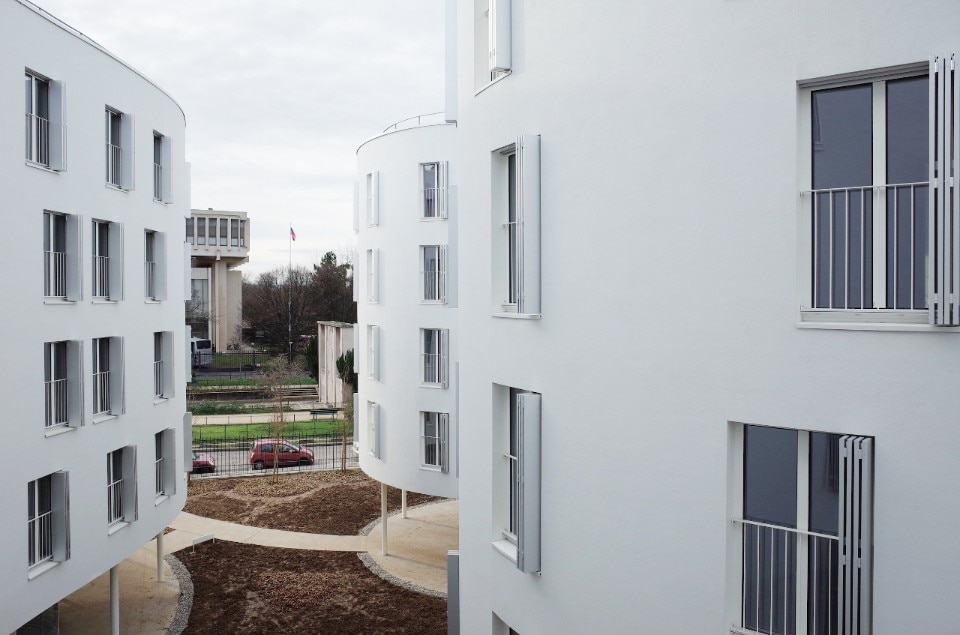 Like a forest, the structure of the complex is unrecognizable at first glimpse and discovered only circuitously. The four buildings are organized like an ensemble of petrified trees to form a set of courtyards with a small footprint at ground level. Hovering above the ground through pilotis permit a fluid physical and visual continuity between the park and the city. A wink towards the Le Corbusier’s Maison la Roche located in this same district of Paris, seems obvious.