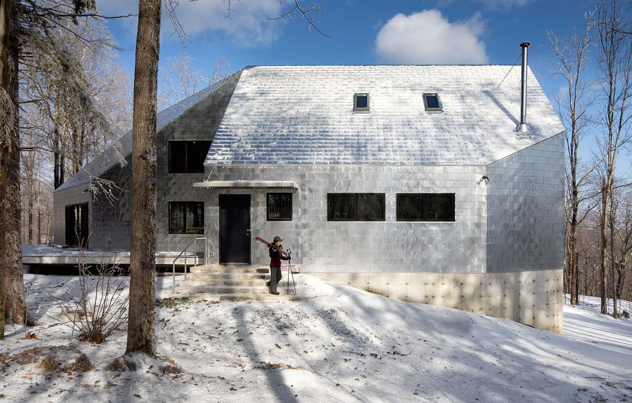 On the outside, a recycled aluminium skin reflects the surrounding landscape, while the wooden inner shell provides the warmth typical of mountain huts. The Silver House, designed by Bryanoji Design Studio in Princeton, USA, was born from a shared vision between architects and client, both pragmatic and open-minded. The building is mostly made up of recycled or reused components: the shingles of the cladding, the external marble steps, the plywood panels used for the interiors, some furniture recovered from the local junkyard... In general, at every stage of the construction process the building's energy impact has been minimised. The volume of the house comes from the intersection of two volumes, shaped to save trees and protect the resources of the existing wetlands, capture the best views of the mountain landscape and intercept the currents to be able to ventilate the house naturally.