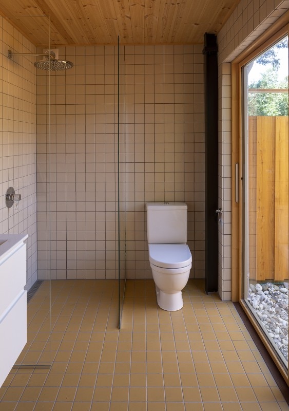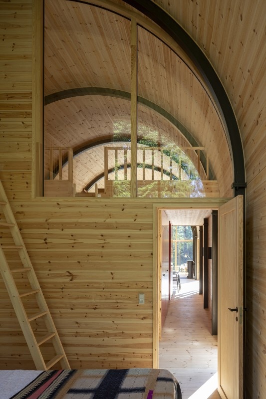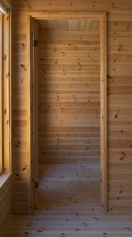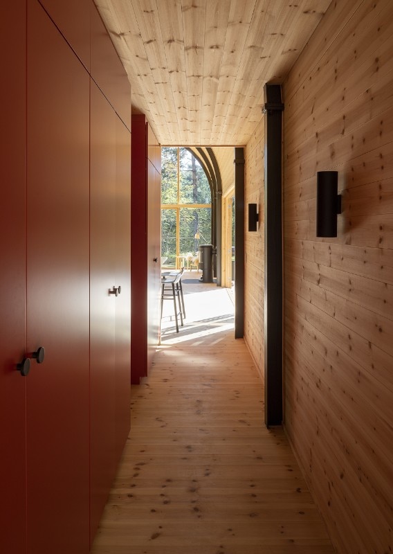 Within the house’s dry rooms, eight dark structural steel portals contrast with the integral pine wood cladding of all horizontal and vertical surfaces. Architects underline how “nothing is white” in this architecture: kitchen’s furniture is dark blue, cabinets in the corridor are dark red, bathroom’s tiles are ocher.
