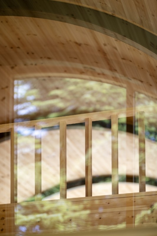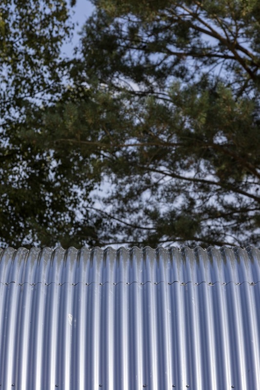Few materials are selected: on the outside, the vertical walls’ wooden planks and the roof’s rolled steel plates emphasize, through their precise, rhythmic chiaroscuro, the directionality of an architecture which seems to be “sliced by meter”, following the required program.