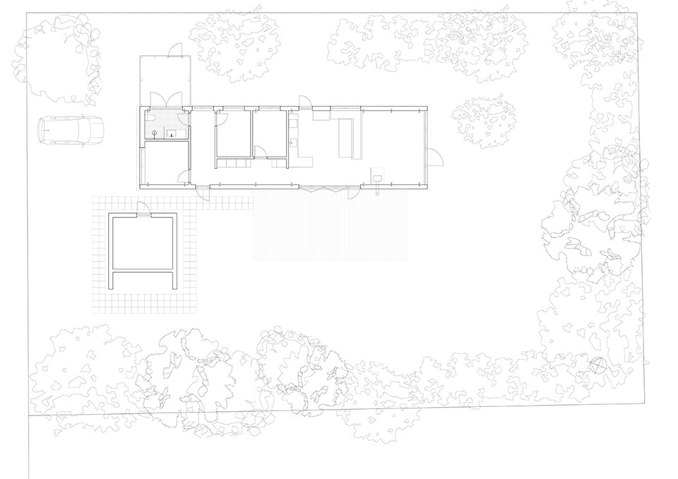 The general atmosphere is certainly one of a holiday house which opens up towards the summer sunshine, for instance through the living room’s entirely glazed short façade, and through the wooden deck which continues its space on the outside. Still, the building is also clearly preoccupied with protecting its inhabitants from the harsh elements of the northern climate. It is not by chance if the only object that stands out from its compact volume is its stove's shiny tarnished chimney.