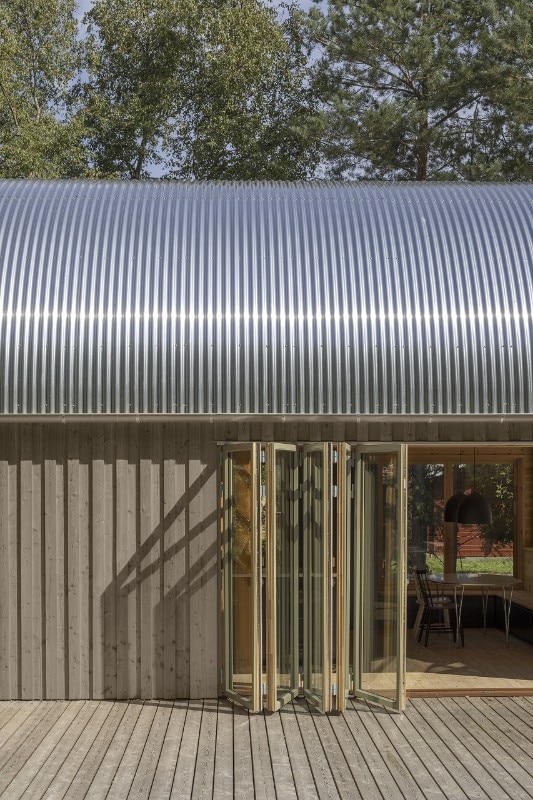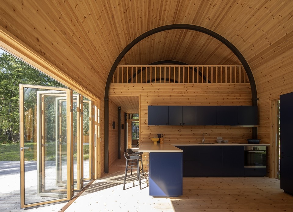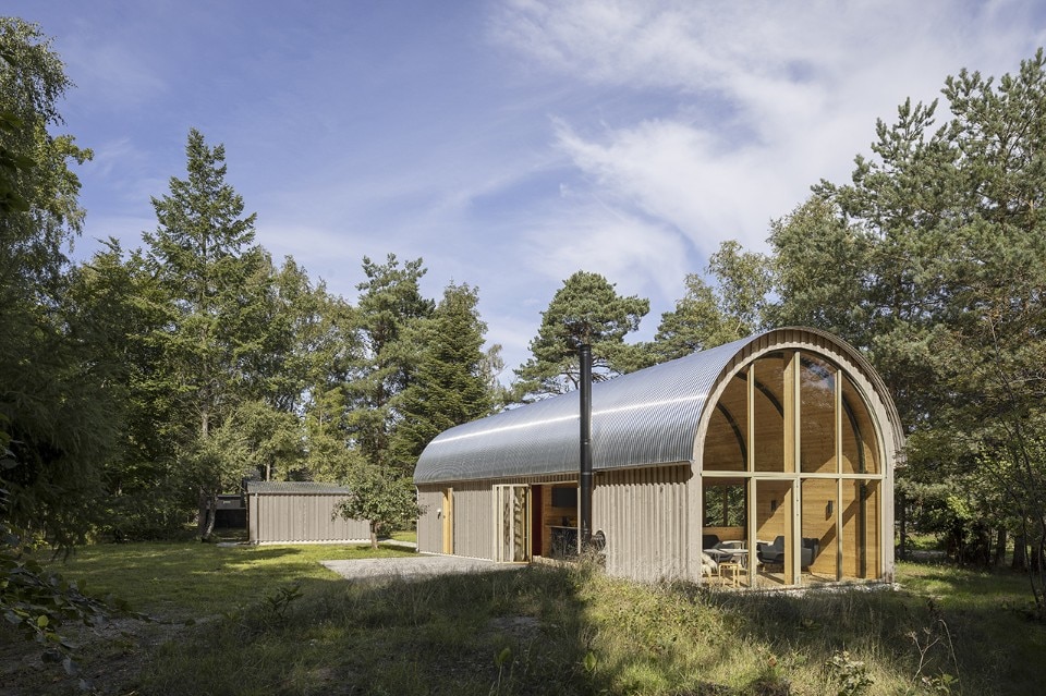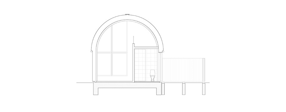 The building dismisses the traditional double-pitched roof silhouette, and it is built up as the extrusion of a barrel-vault section along a relatively elongated rectangular plan. The overall image is reminiscent of a short stretch of a tunnel, a little hangar fitted for a domestic use.