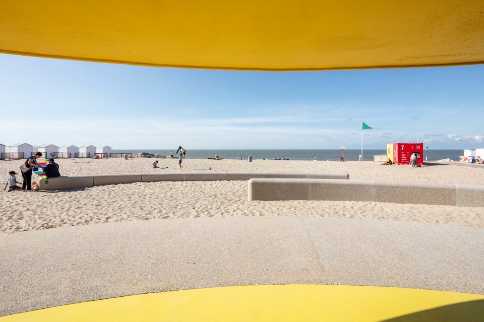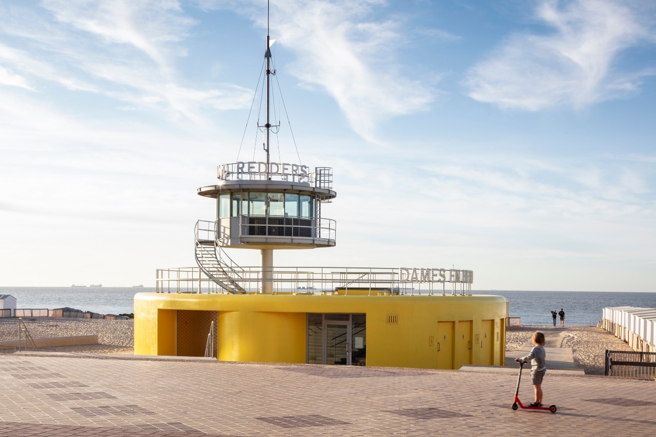 “The mere act of building yet another construction on the Belgian coastline is rather problematic in itself. The coastline is notorious. A 60km stretch of concrete slabs facing the Northsea” the partners of the firm Compagnie O architects tell us. “We morphed the functional programme into this playful pavilion in an attempt to avoid the act of building itself. By displacing the building from the dike onto the beach we literally leave behind the safety of the concrete strip and turn the presupposed safety building into a toy in the sand.”