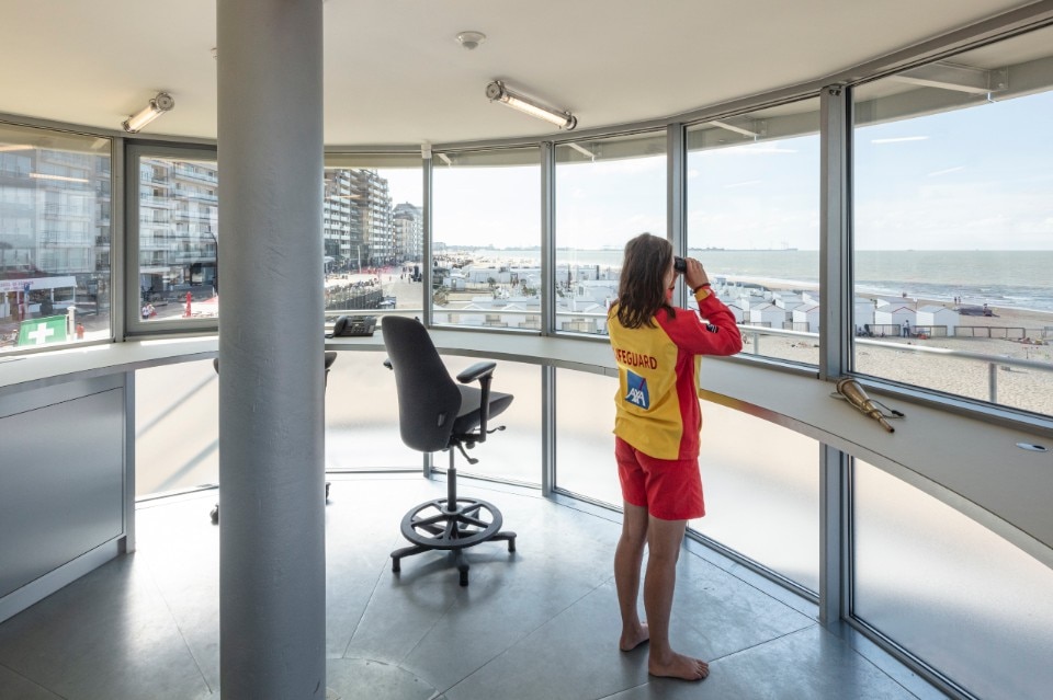 Connected to twelve other guard points along the shore, the pavilion houses not only lifeguards but also a police station, a first aid station, a garage for vans and lifeboats and public toilets.