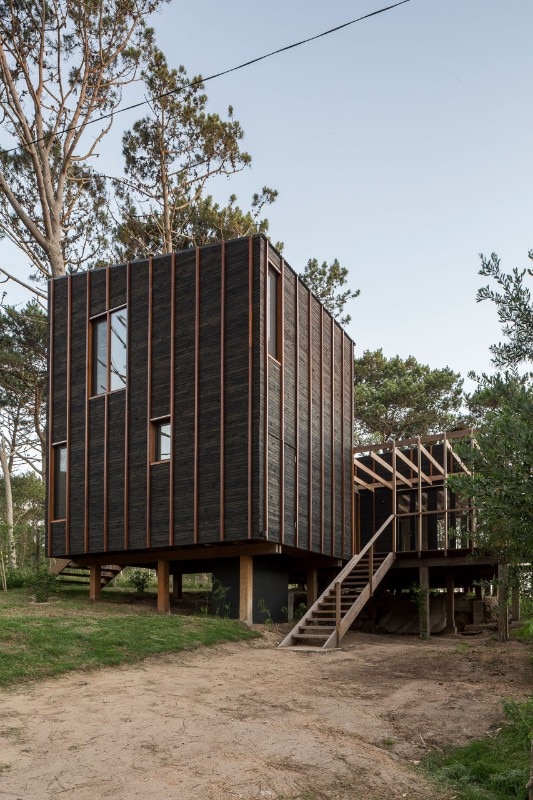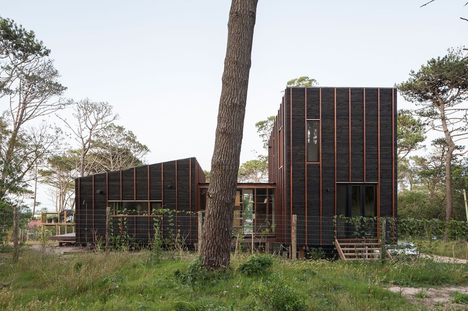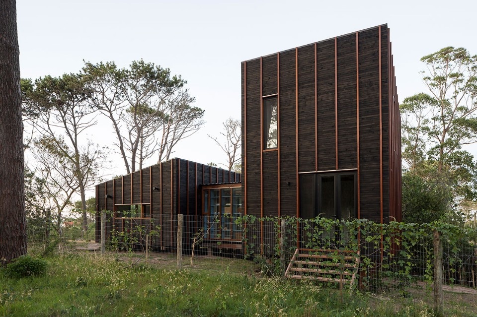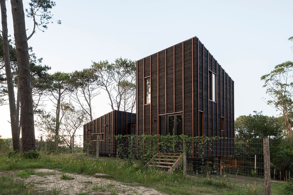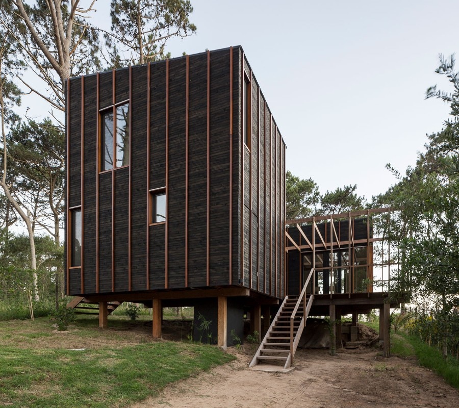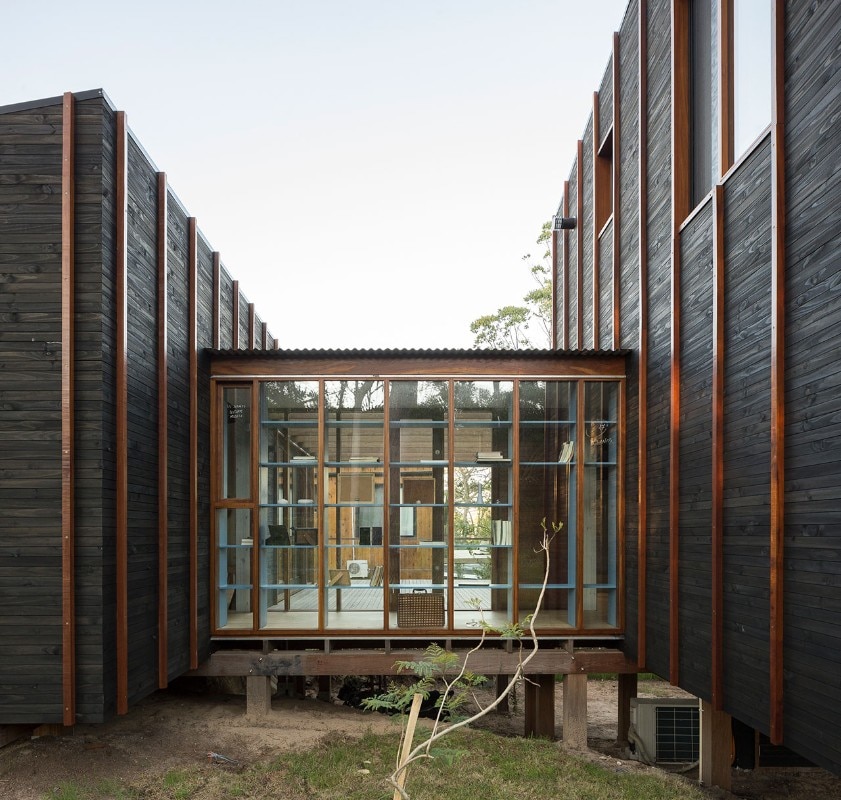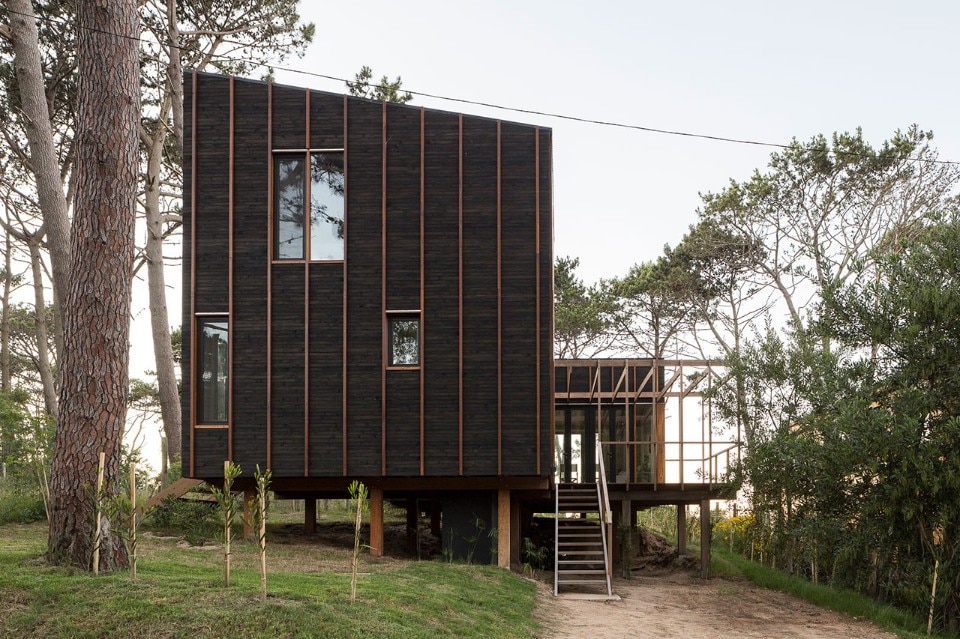 Located near the José Ignacio Lagoon and the Atlantic Ocean, the residence designed by Fram Arquitectos and Delfina Riverti is the stilted structure made of different types of wood, forming in a composition of two main volumes connected by a glass gallery.