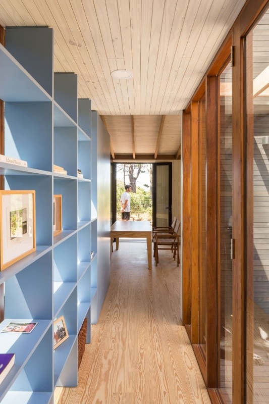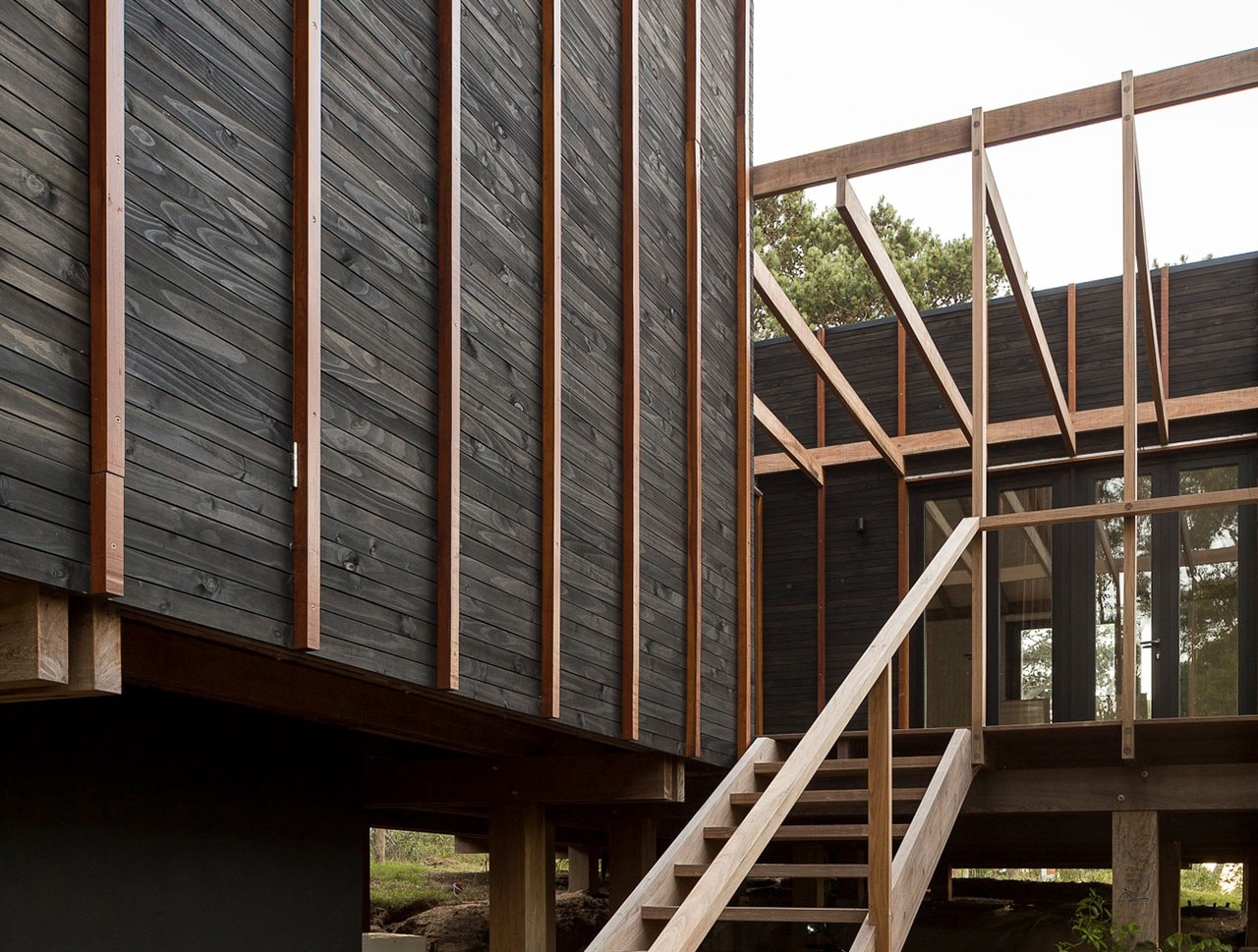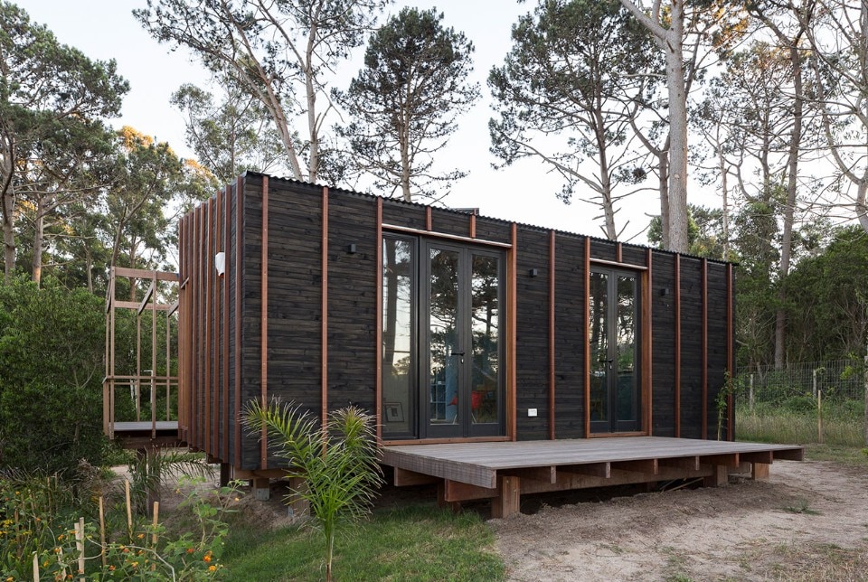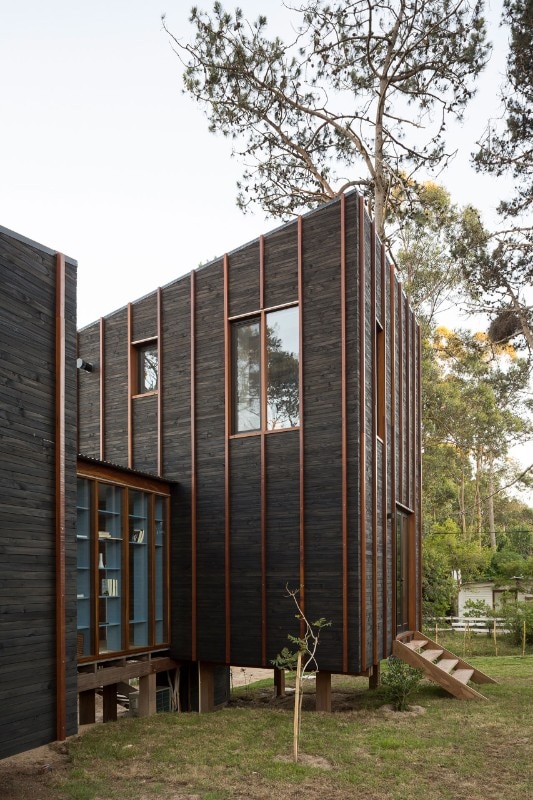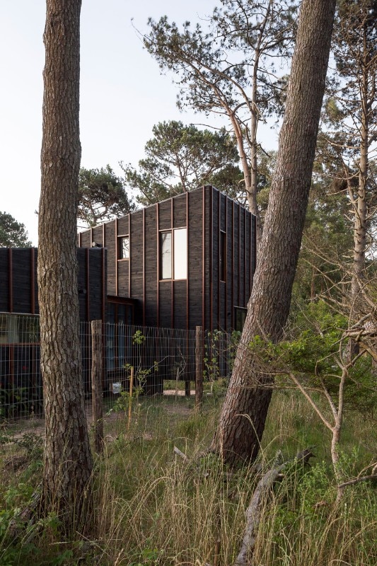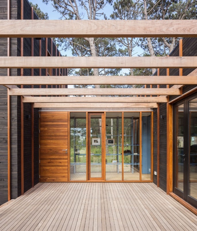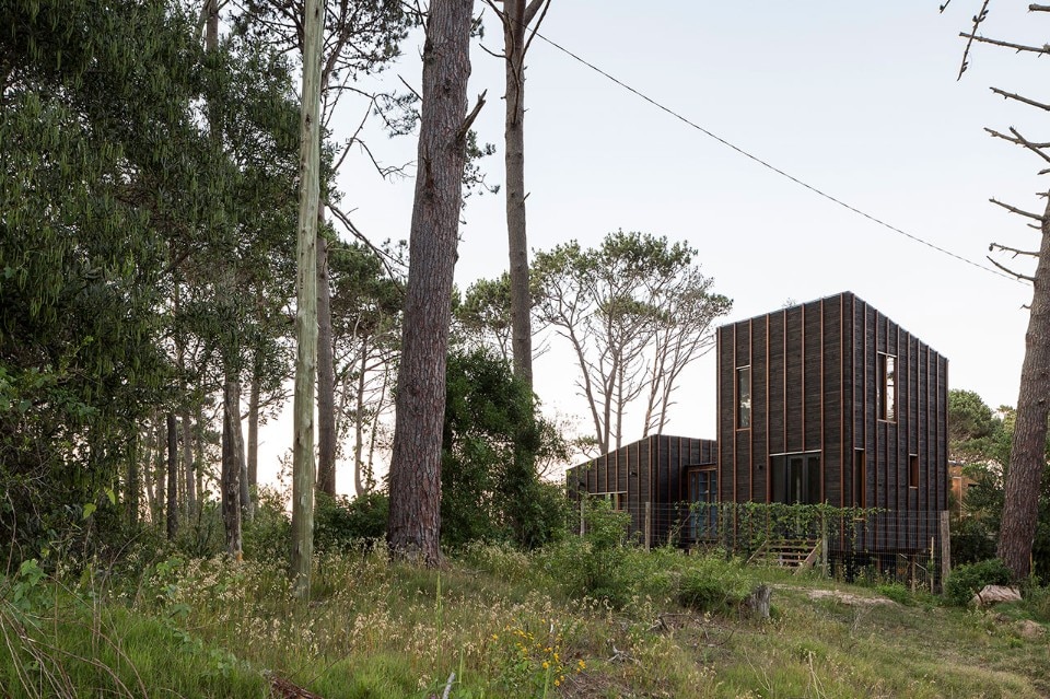 Located near the José Ignacio Lagoon and the Atlantic Ocean, the residence designed by Fram Arquitectos and Delfina Riverti is the stilted structure made of different types of wood, forming in a composition of two main volumes connected by a glass gallery.