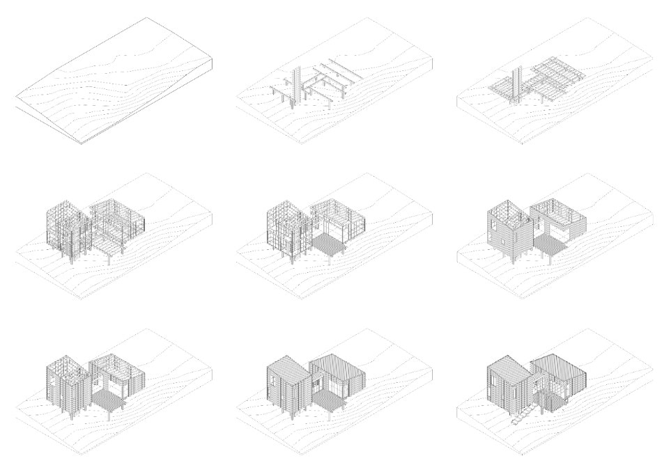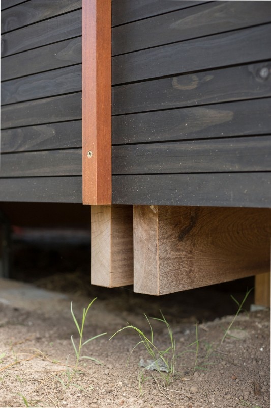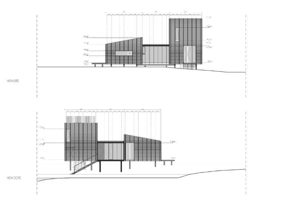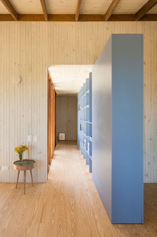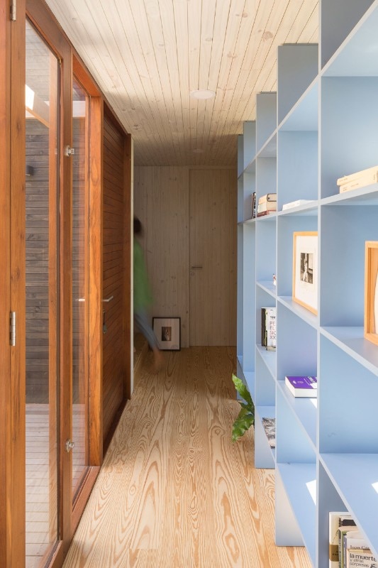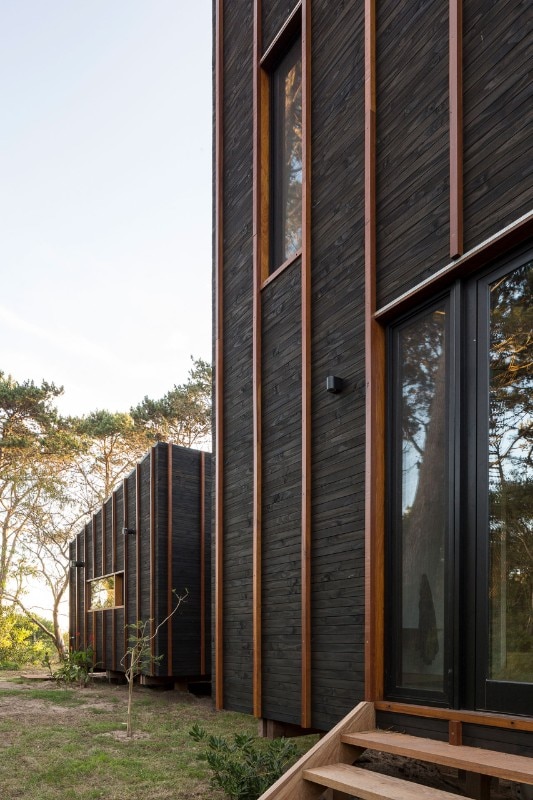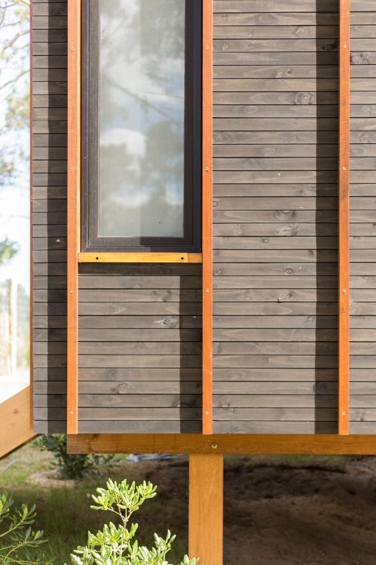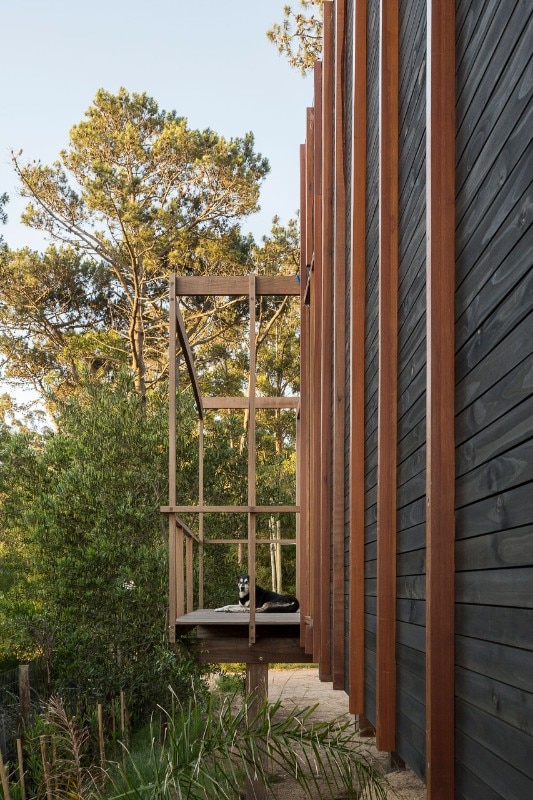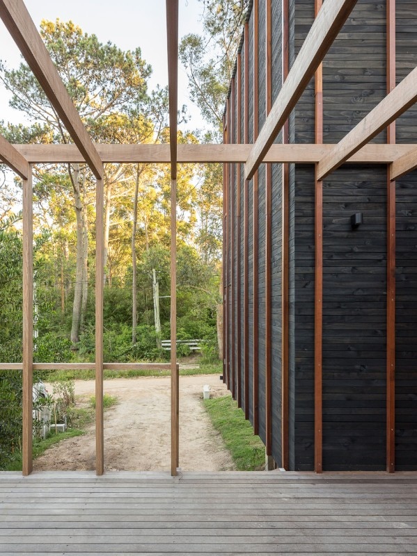 Except for the foundations, Casa a la Juanita is an entirely wooden structure. It is rare to find constructions made of such a wide range of timber, which, at the same time, choose to exhibit this characteristic expressively. In the residence, different qualities of the wood used alternately according to the specific property. On the facades, for example, the oil-stained pinewood cladding is punctuated by vertical elements of massaranduba, a wood with a very dense fiber in shades of red: a motif that follows the pattern of the construction module.