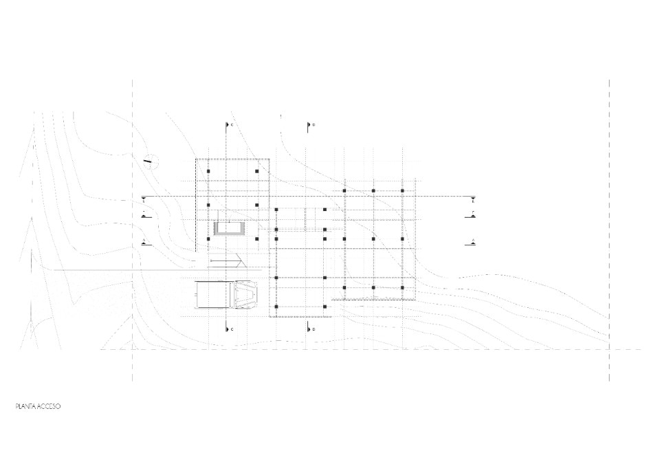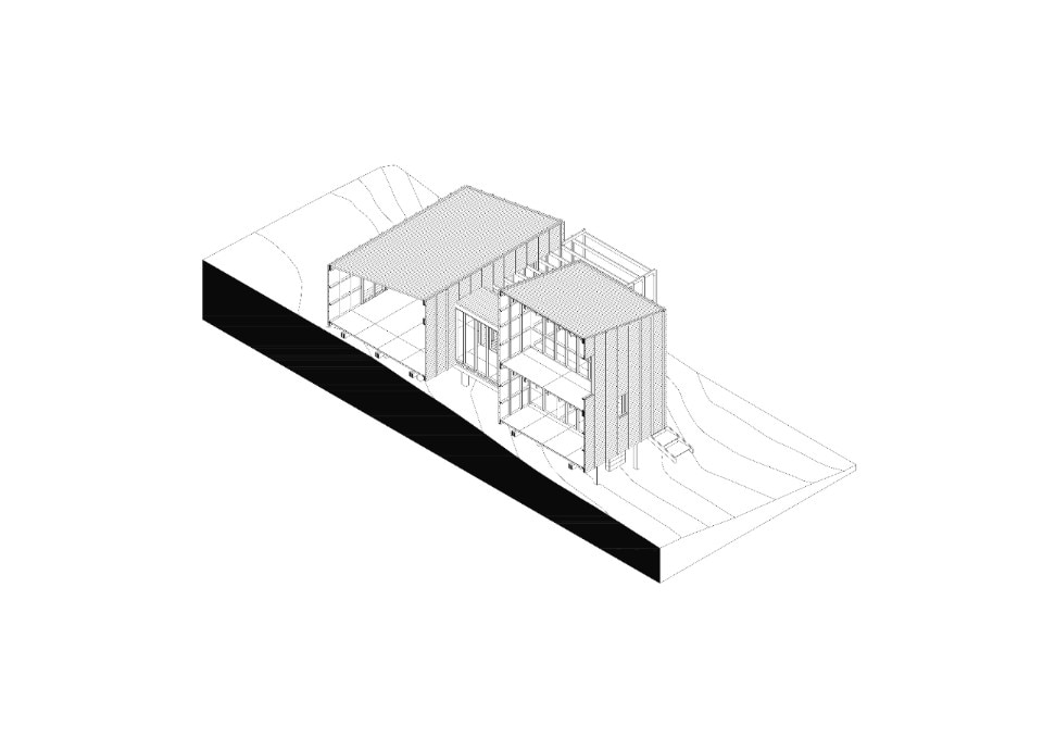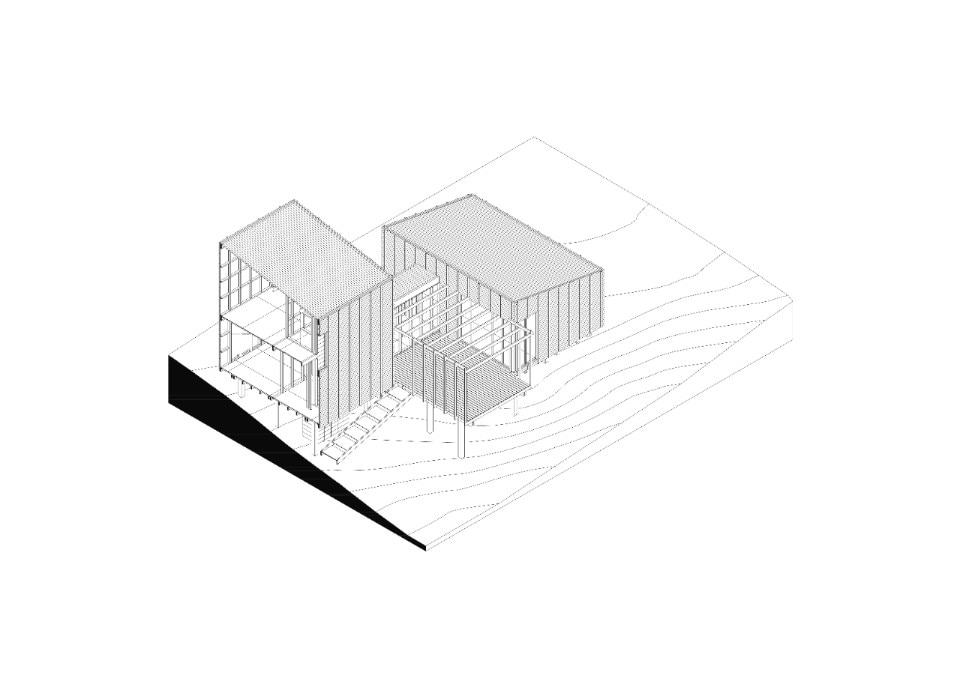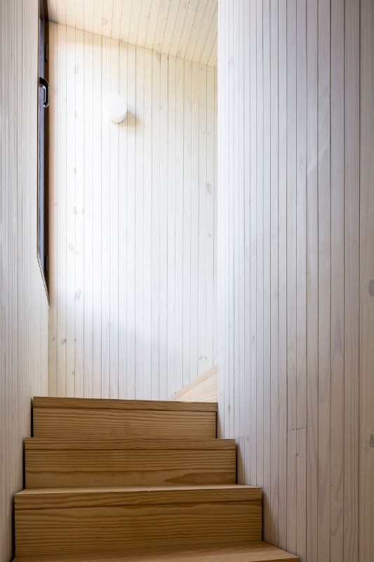 House in La Juanita sits on a sloping plot, raised to ensure ventilation of the lower parts of the structure. The residence has the typical orientation of houses on the Uruguayan coast: you enter through a staircase from the north side, where there is also the access road to the lot, while the south side faces the ocean. The two volumes share the same floor hight, and each one contains a function: the lower one includes the common areas - namely, kitchen, living room, and dining room - while the two-story one hosts the bathrooms and the sleeping area.