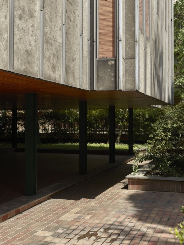 Follow photos of the Case Feal by Marco Zanuso, two mirror bodies – each with four floors above ground – connected by a permeable ground floor, thanks to the use of steel pilotis. The photos depict the contrast between the freshness of the plants in the courtyard and the grey trachyte panels of Milanese tradition.
