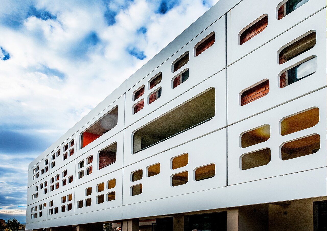 Constructed on four floors, the building consists of two longitudinal reinforced concrete volumes, joined by a central atrium. The north wing houses the spaces dedicated to teaching, while to the south are the laboratories and staff offices.