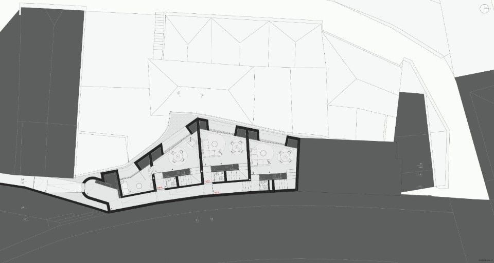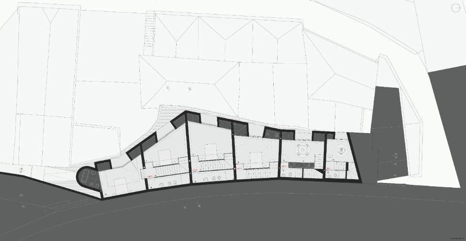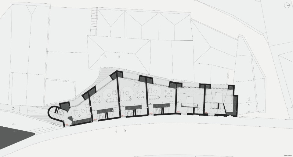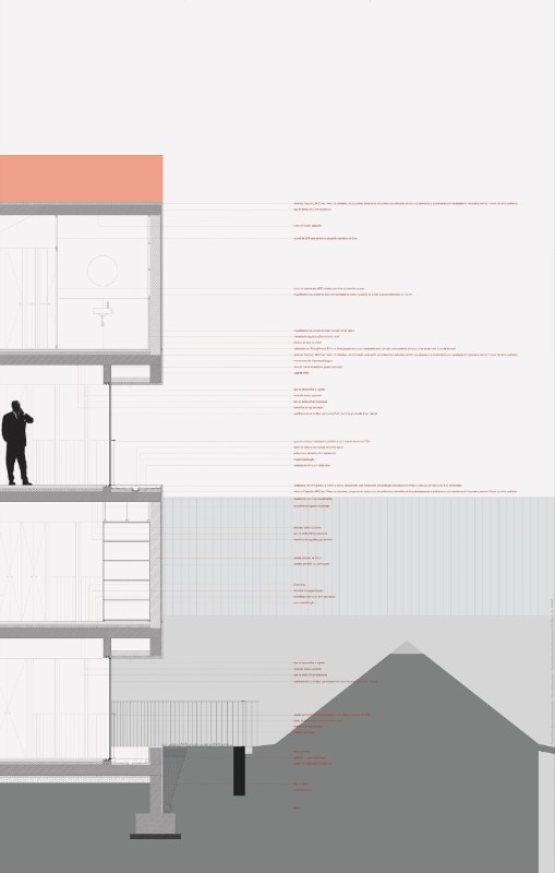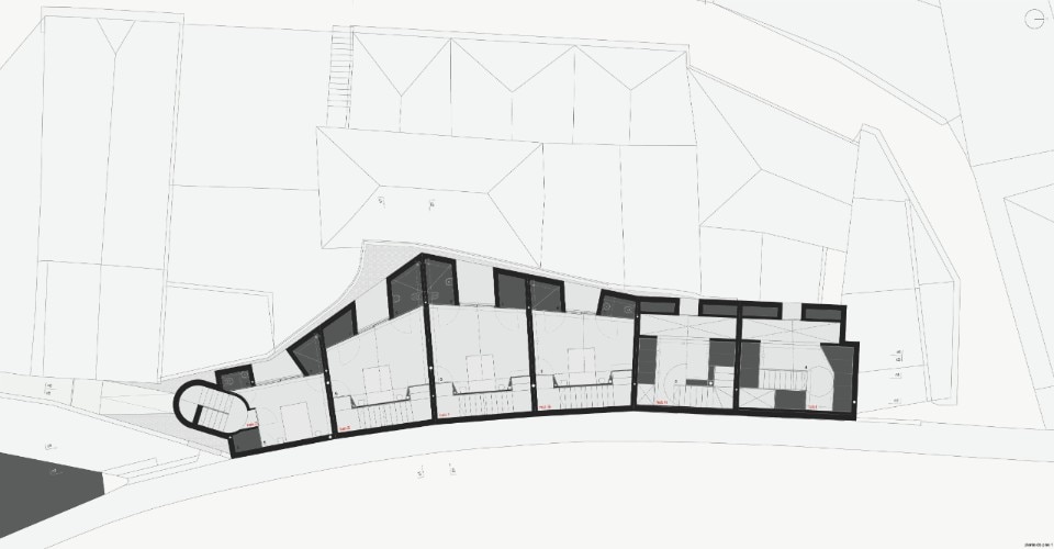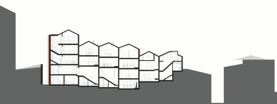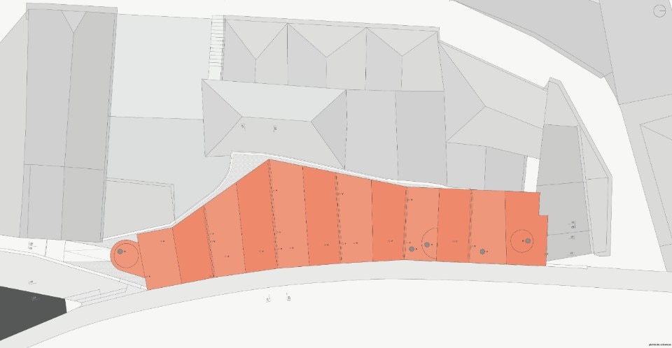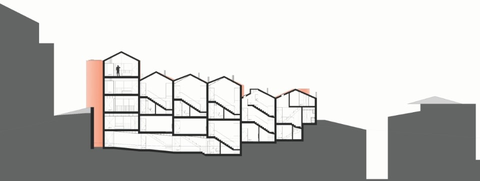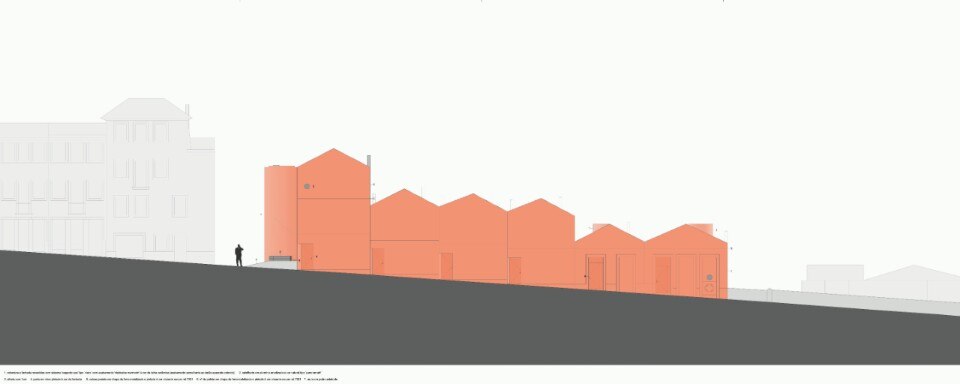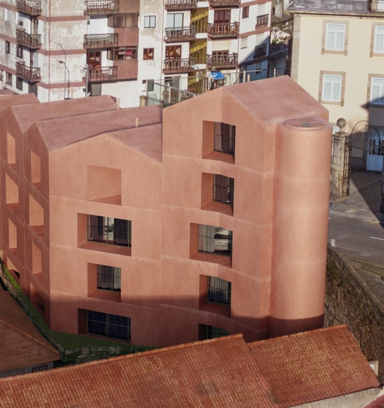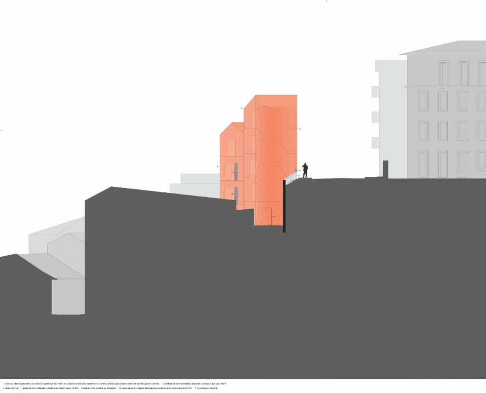 The concept of the project by Caiano . Morgado Arquitectos, which began in 2019, takes advantage of these strict local construction rules in their proposal of a new residential building, where local identity blends with the more contemporary design of architecture. The red of the Portuguese roof-tiles colours the entire fabrication, though designed to be made of pigmented concrete. The condominium, moreover, takes advantage of the sloping trend of the available lot to fragment its length into six blocks, each of which has its own roof with sloping pitches.
