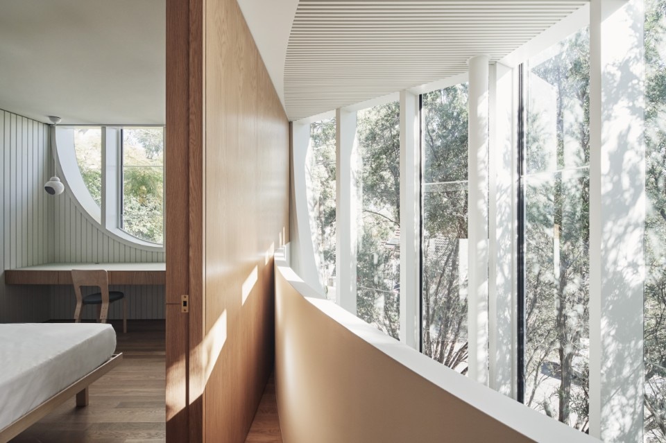 As a reference to the curved openings and entrance porches of the surrounding houses, the simple shell of the Glebe House is articulated with arched openings, which, however, unlike the main reference, are presented both in elevation and plan. The windows, in fact, are aligned with the floor cuts of the first floor, to create three-dimensional internal voids, increasing, thus also increasing the entrance of light at the center of the habit, and increase the sense of space.
