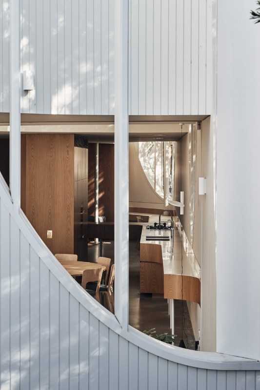 The elevations are also characterized by vertical panels in white painted wood that reproduce the materiality of the traditional cottages in the area. The large windows are rhythmed by vertical wooden uprights, which further reinforce the sense of verticality.
