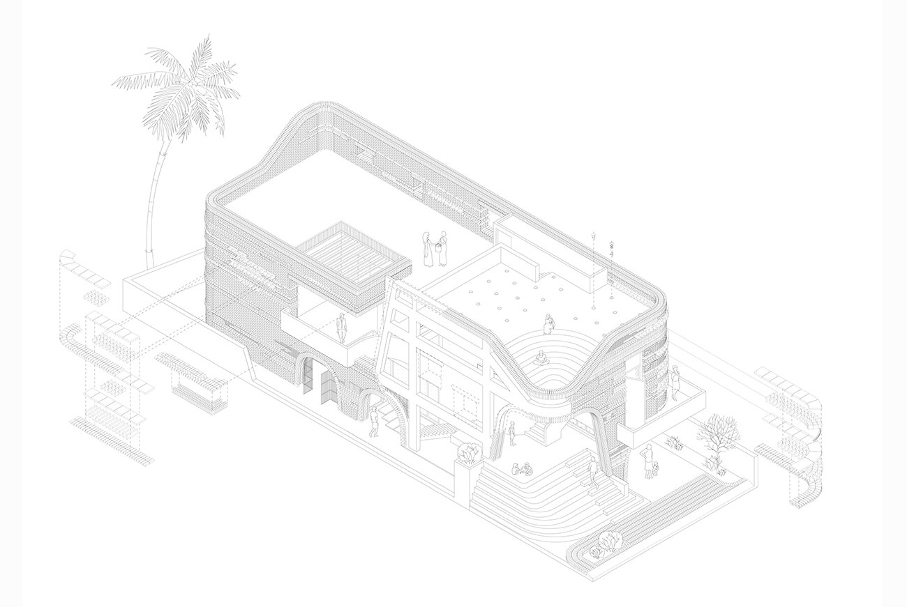 The building is designed over an area of 330 square meters and to maximize its public utility, it is designed to extend out onto the street, both visually and physically. A festive procession is held every year along the narrow, winding streets of the neighborhood as part of a cultural celebration. The building descends towards the street forming a gallery for the spectators, who gather at the side of the street during the event. Through careful design and a play of volumetric voids, the space of the building is shared with the people of the neighborhood as a gesture of restitution to the local community, without disturbing the privacy and security of the internal functions.