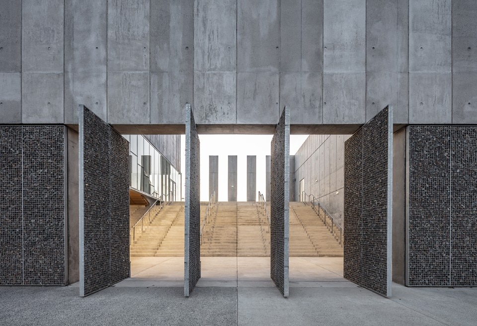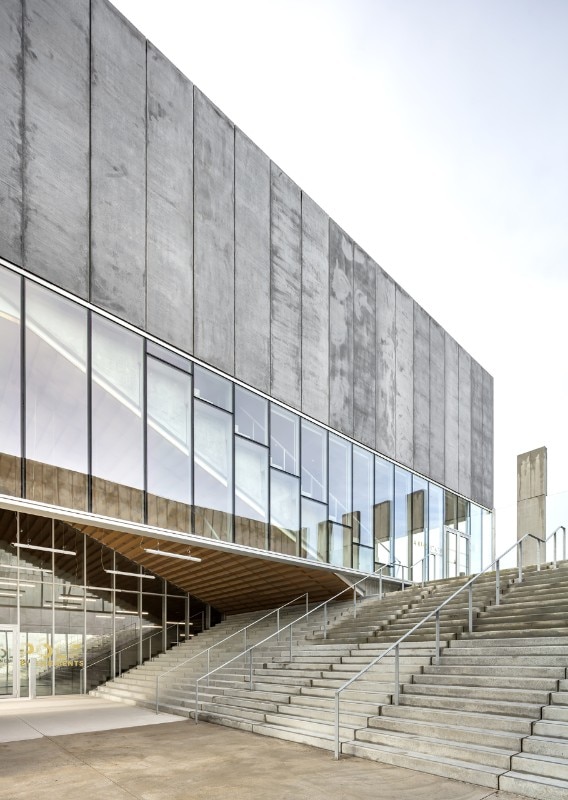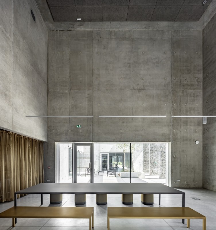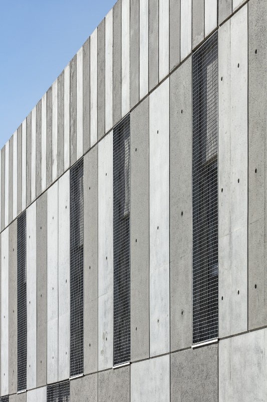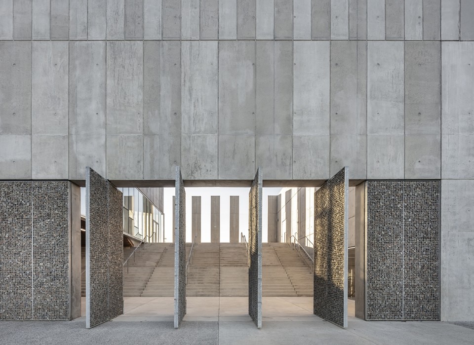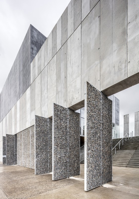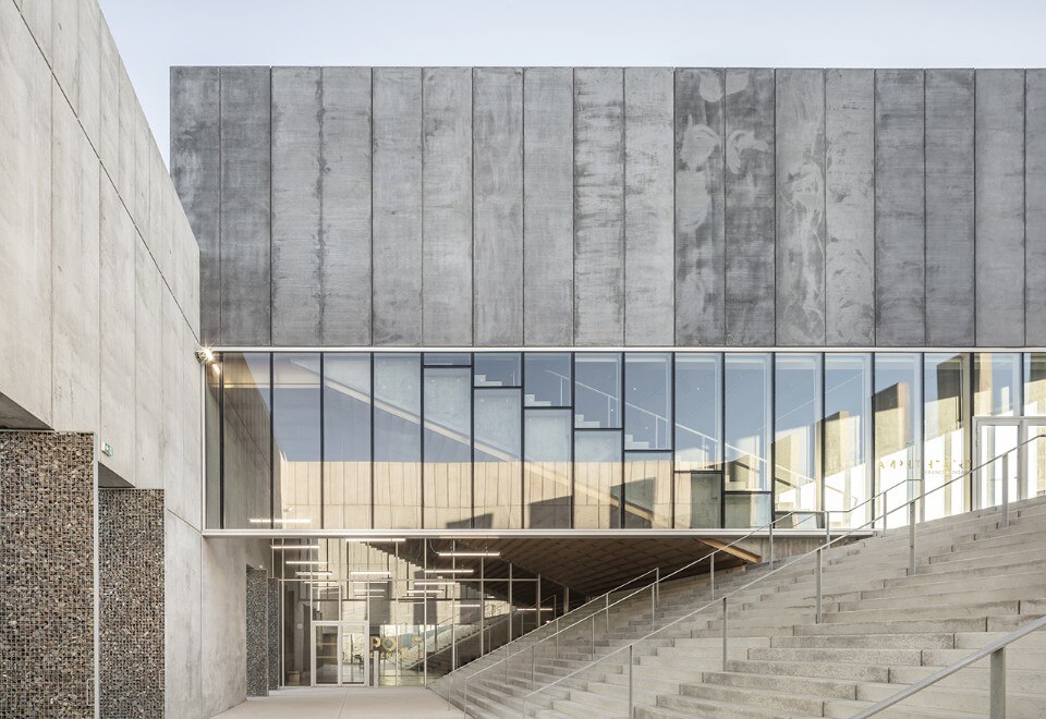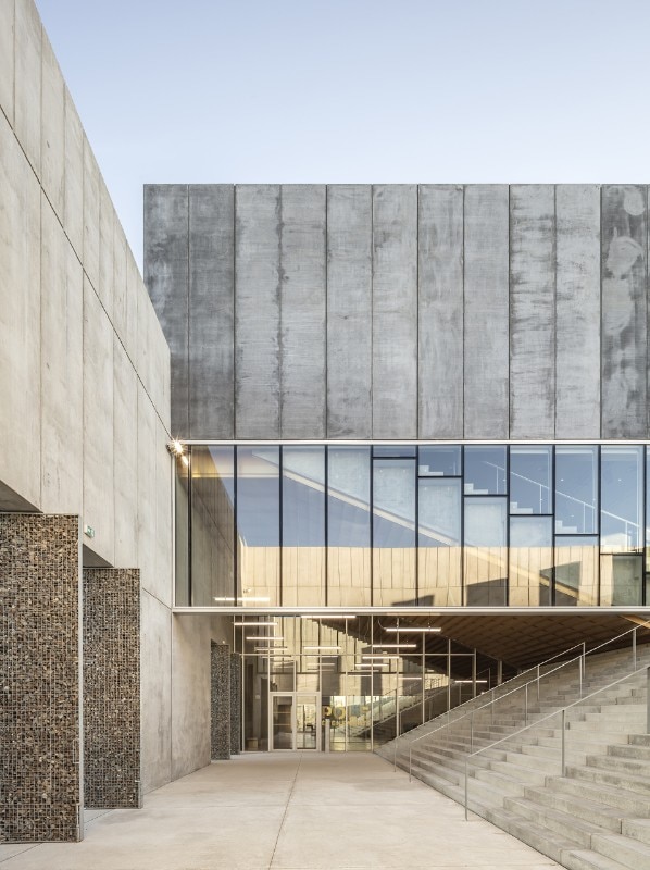 In this sense concrete is an important material for the town, which was completely razed to the ground by bombing during the Second World War and rebuilt by immigrants coming mainly from Italy. Hence the intuition to use cement and aggregates as the only material and to reinterpret the forms of the ramparts.